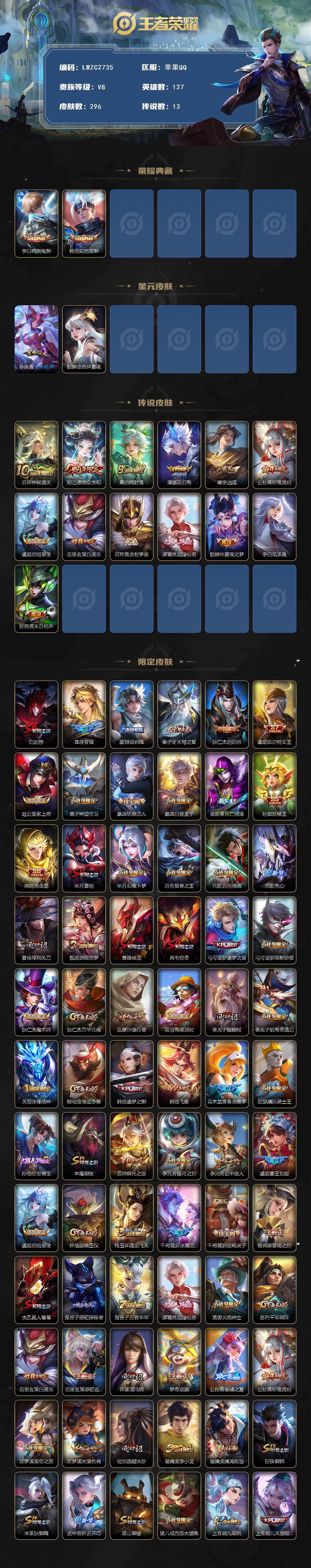 [16541839]可二次【特价出售/店主推荐】金标孙悟空、金标妲己、金标大司命、金标暃、金标项羽、5银标、打野43段,苹果Q-V8-至尊星耀V段位-127英雄-296皮肤-2典藏皮肤-2星传说-13传说-82史诗