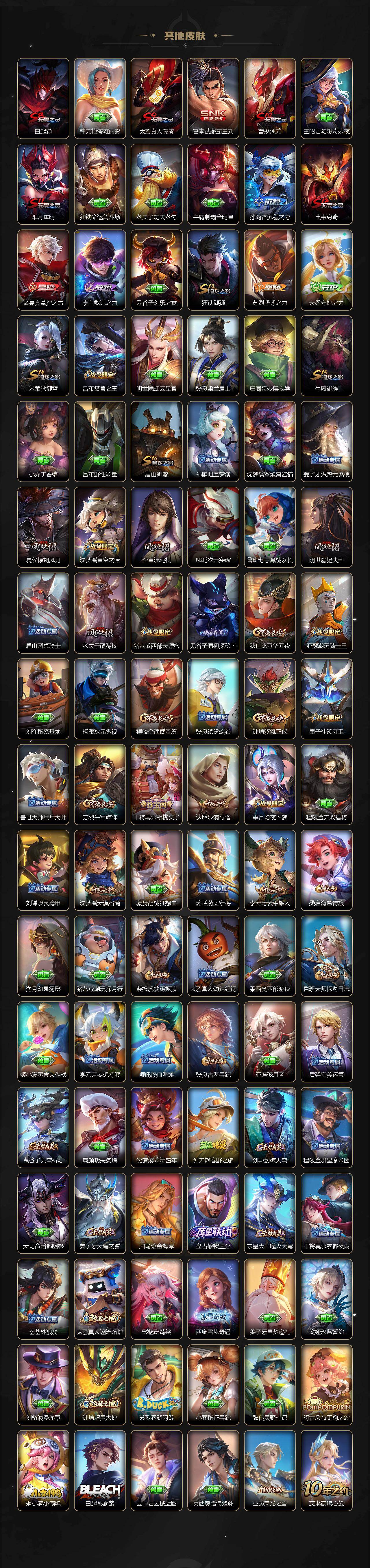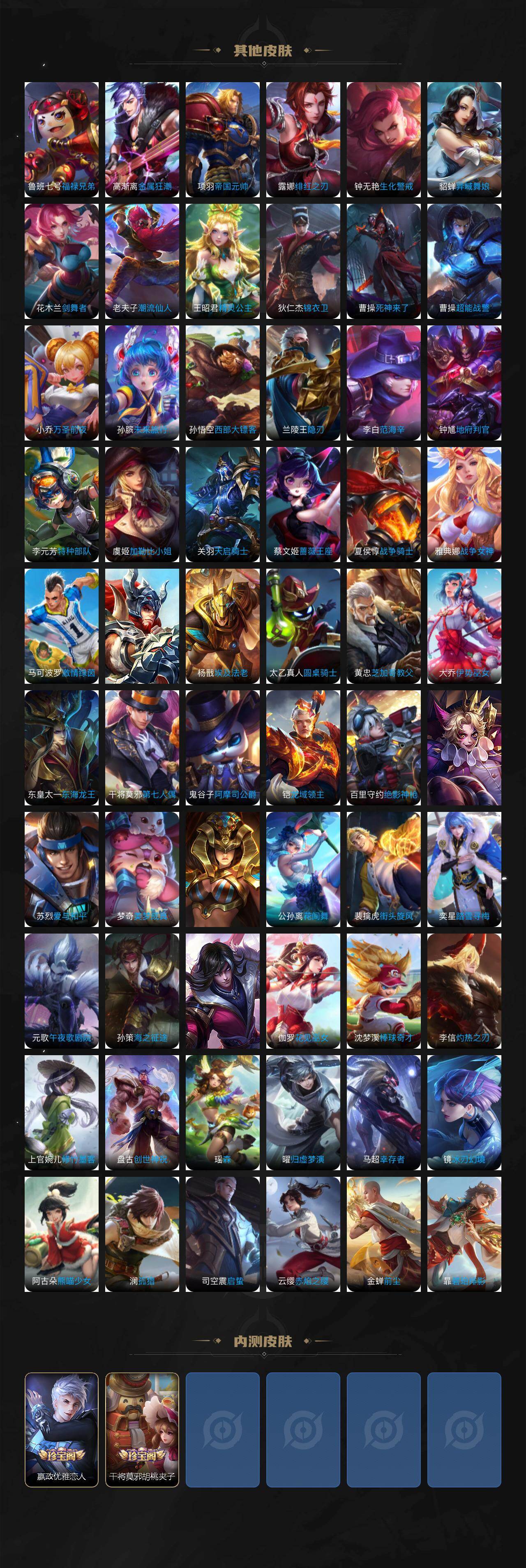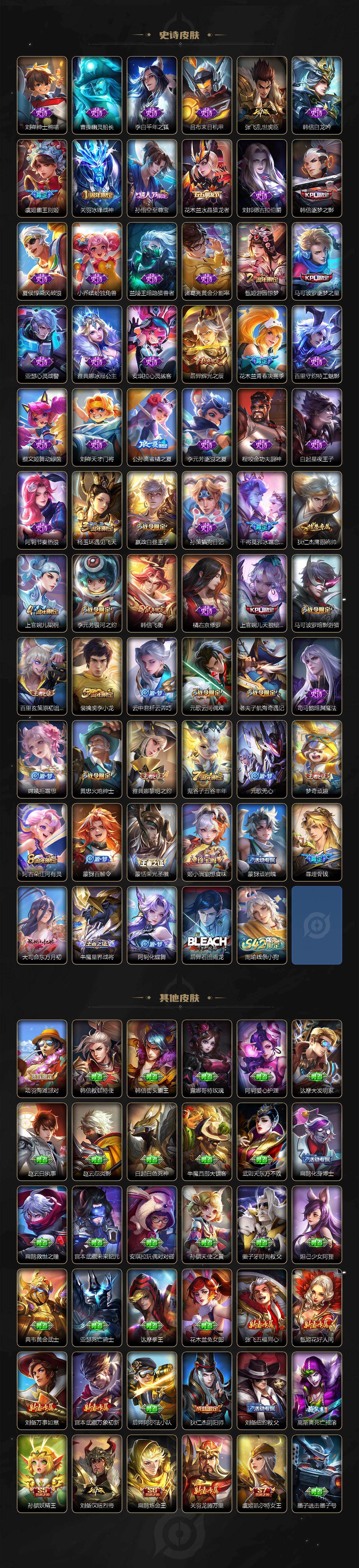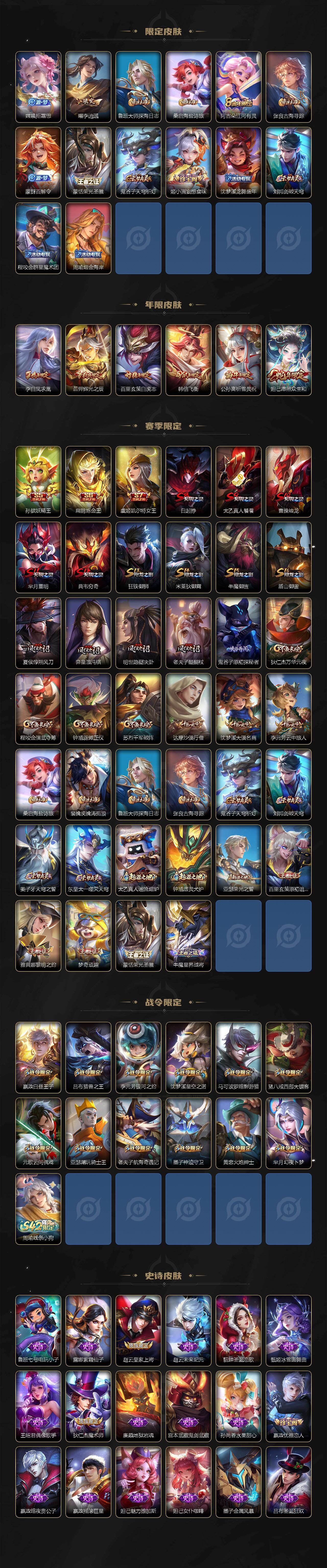 【限定皮肤】:白起狰,暃埋骨钱,蒙犽顽岩魄,姜子牙天穹之誓,狄仁杰阴阳师,虞姬凯尔特女王,赵云皇家上将,墨子神迹守卫,嬴政优雅恋人,嬴政白昼王子,高渐离死亡摇滚,孙膑妖精王,扁鹊炼金王,芈月重明,芈月幻夜卜梦,吕布猎兽之王,元歌云间偶戏,元歌无心,夏侯惇朔风刀,甄姬游园惊梦,曹操烛龙,典韦穷奇,马可波罗逐梦之星,马可波罗暗影游猎,狄仁杰魔术师,狄仁杰万华元夜,达摩沙漠行僧,项羽海滩派对,老夫子醍醐杖,老夫子航海奇遇记,关羽冰锋战神,程咬金演武夺筹,韩信逐梦之影,韩信飞衡,花木兰青春决赛季,亚瑟潮玩骑士王,孙悟空至尊宝,牛魔御旌,后羿辉光之辰,李元芳银河之约,李元芳云中旅人,虞姬霸王别姬,虞姬启明星使,钟馗驱傩正仪,杨玉环遇见飞天,干将莫邪冰霜恋舞曲,干将莫邪胡桃夹子,雅典娜黎明之约,太乙真人饕餮,鬼谷子原初探秘者,鬼谷子五谷丰年,诸葛亮武陵仙君,黄忠火炮绅士,苏烈千军破阵,百里玄策白虎志,百里玄策原初追逐者,弈星混沌棋,梦奇顽趣,公孙离蜜橘之夏,公孙离祈雪灵祝,沈梦溪星空之诺,沈梦溪大漠名商,明世隐疑决卦,裴擒虎李小龙,裴擒虎擒涛扼浪,狂铁御狮,米莱狄御霄,云中君纤云弄巧,盾山御銮,猪八戒西部大镖客,上官婉儿梁祝,上官婉儿天狼绘梦者,嫦娥拒霜思,曜李逍遥 ,鲁班大师探海日志,桑启海盐诗旅,阿古朵江河有灵,张良古海寻踪,蒙犽百解令,蒙恬荣光圣徽,鬼谷子天穹祈灯,姬小满妄想食味,沈梦溪龙舞盛年,刘邦剑破天穹,程咬金群星魔术团,周瑜熔金海岸