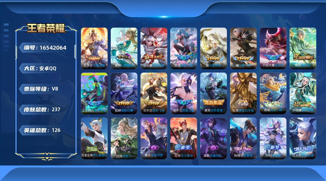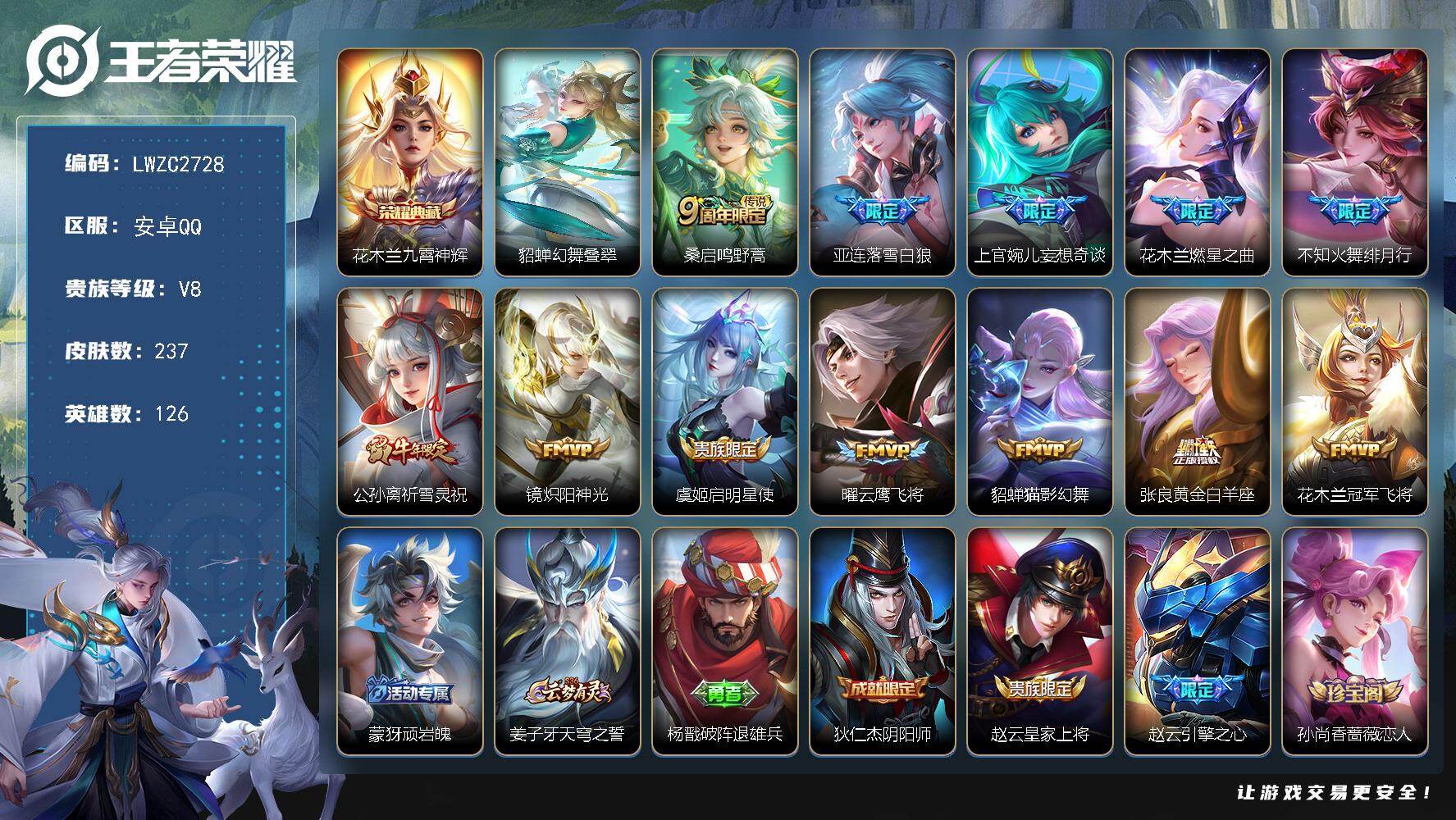 [16542064]【特价出售/店主推荐】安卓Q-V8-永恒钻石IV段位-126英雄-237皮肤-1典藏皮肤-1星传说-12传说-62史诗