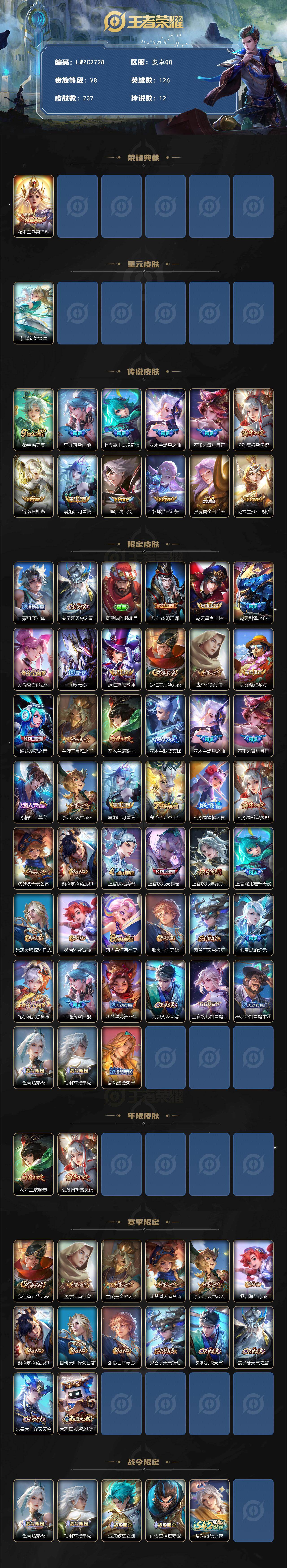 - [11520241]V9 4典藏 27传说 125英雄 278皮肤 典藏英雄武则天 可修改实名 优质装备:天鹅之梦(小乔典藏),倪克斯神谕(宇宙婆娘),杀手不太冷,鸣剑·曳影,黄金射手座,猫影幻舞,炽阳神光,仲夏夜之梦(大飞蛾),音你心动-小乔,音你心动-周瑜,胖达荣荣,乞巧织情,游龙清影(小青龙),遇见胡旋,花朝如约(花篮子),挚爱之约,挚爱花嫁,无双飞将,山海·炽霜斩(李信年限),山海·琳琅生(小乔年限),山海·苍雷引(电光曜子),炽翼辉光(娃娃菜牛角包) 珍宝阁皮:优雅恋人,玩趣恶龙 限定皮:鸣野蒿,凤凰于飞,前尘镜,绯月行,时之彼端,白鹤梁神女,白晶晶,神威(电光马子),飞衡(韩信年限),玄嵩(庄周年限),山海·碧波行(瑶年限),无限倾心-项羽,遇见飞天,高山流水,无限倾心-虞姬,五谷丰年,幽恒(沐浴露),天狼溯光者,祈雪灵祝(雪兔子),李小龙,如梦令-嫦娥,默契交锋-花木兰,纯白花嫁,孙行者,一生所爱,蜜橘之夏,热情桑巴,女儿国国王,寅虎·心曲(虎婆),时之祈愿-云中君,时之祈愿-瑶(瑶传限),玉兔公主,启示之音,时之奇旅-妲己,神器·万象笔,山海·玄木吟(马可年限) 史诗皮:星界战将,涂山红红,乘龙·聚宝船(安琪拉年限),遇见神鹿,紫霞仙子,电玩小子(小书包),黄金分割率,特工魅影,永昼,魅语,蒙恬荣光圣徽,无限星赏官,青蛇,偶像歌手,白蛇,晚萤,暗夜猫娘,龙骑士(小龙虾),末日机甲-吕布,猫狗日记-大乔,时之恋人-孙尚香,乱世虎臣,节奏热浪,修罗,女仆咖啡,水果甜心,绅士熊喵,天才门将,心灵骇客,时之奇旅-安琪拉,功夫厨神,德古拉伯爵,暗隐猎兽者,幽灵船长,鬼剑武藏,心灵战警,舞动绿茵,地狱岩魂,诗语江南,繁星吟游(呼啦呼啦),拒霜思,缤纷独角兽,乘风破浪,逐浪之夏,龙鼓争鸣,月团寄思,水晶猎龙者,曙光守护者,箭羽风息,金属风暴,原初追逐者,圣诞狂欢,圣诞恋歌,鹰眼统帅,魅力维加斯,奇遇舞章,千筹问战,无心,未来纪元-赵云