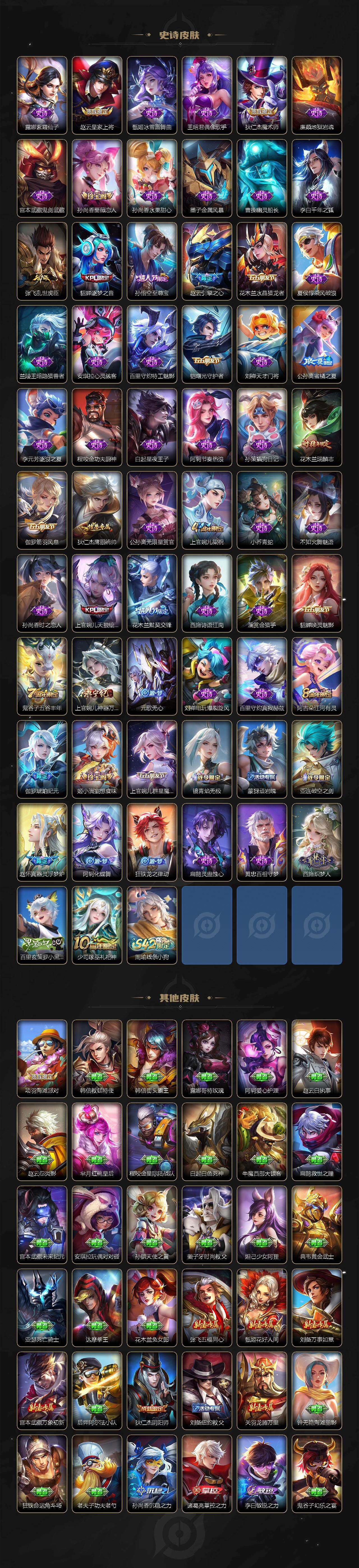 【史诗皮肤】:露娜紫霞仙子,赵云皇家上将,甄姬冰雪圆舞曲,王昭君偶像歌手,狄仁杰魔术师,廉颇地狱岩魂,宫本武藏鬼剑武藏,孙尚香蔷薇恋人,孙尚香水果甜心,墨子金属风暴,曹操幽灵船长,李白千年之狐,张飞乱世虎臣,貂蝉逐梦之音,孙悟空至尊宝,赵云引擎之心,花木兰水晶猎龙者,夏侯惇乘风破浪,兰陵王暗隐猎兽者,安琪拉心灵骇客,百里守约特工魅影,铠曙光守护者,刘禅天才门将,公孙离蜜橘之夏,李元芳逐浪之夏,程咬金功夫厨神,白起星夜王子,阿轲节奏热浪,孙策猫狗日记,花木兰瑞麟志,伽罗箭羽风息,狄仁杰鹰眼统帅,公孙离无限星赏官,上官婉儿梁祝,小乔青蛇,不知火