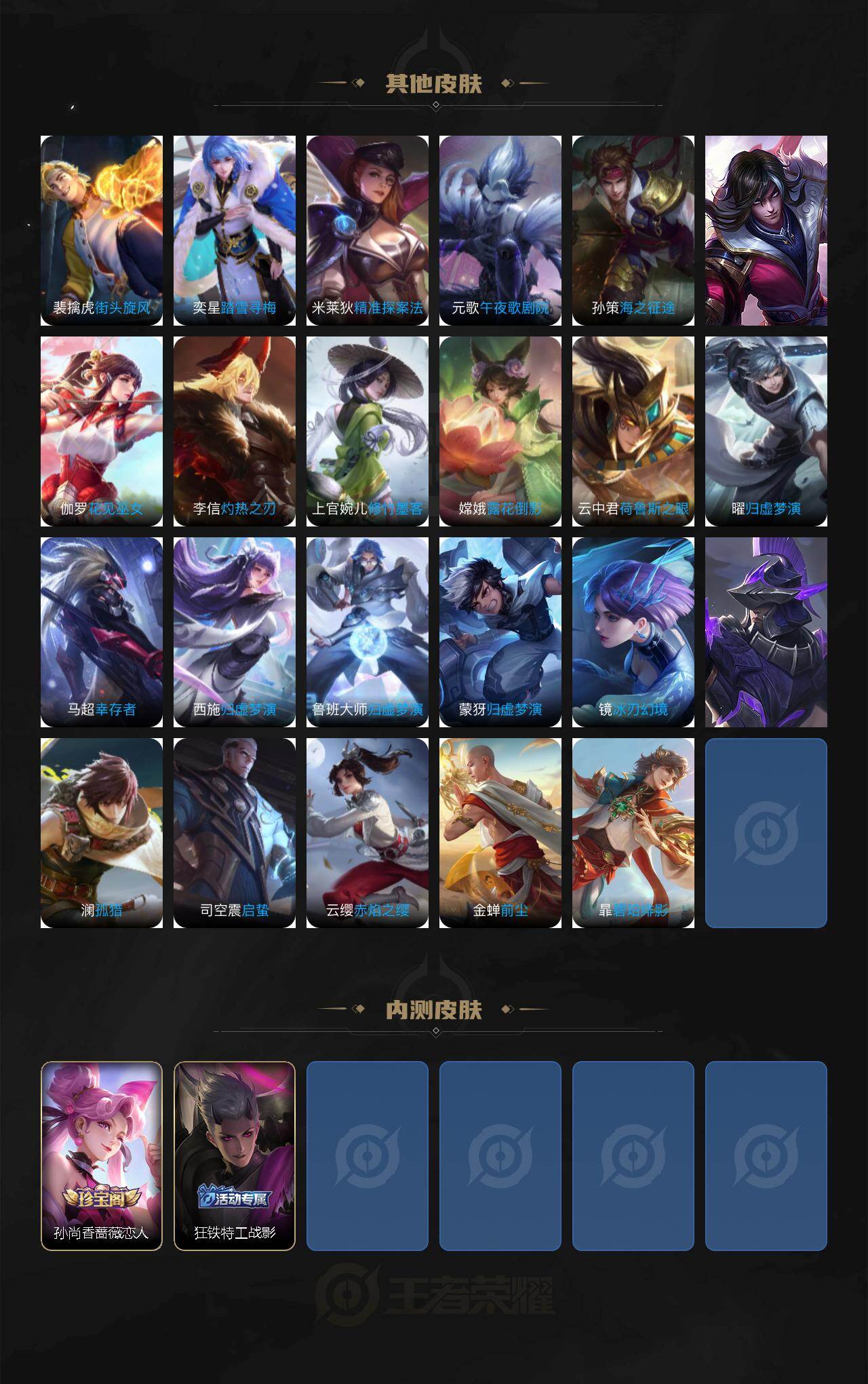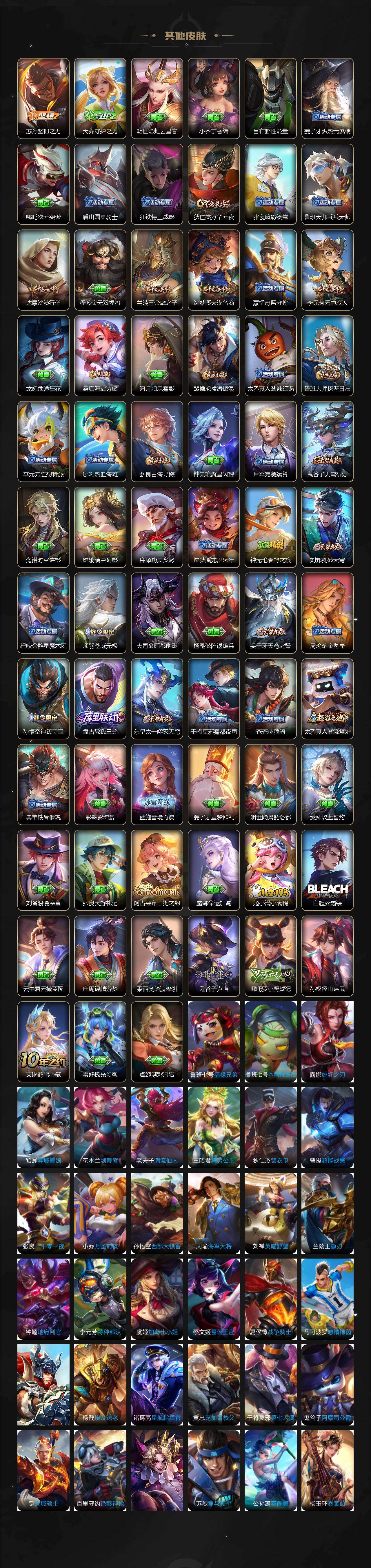 【限定皮肤】:蒙犽顽岩魄,姜子牙天穹之誓,杨戬破阵退雄兵,狄仁杰阴阳师,赵云皇家上将,赵云引擎之心,孙尚香蔷薇恋人,元歌无心,狄仁杰魔术师,狄仁杰万华元夜,达摩沙漠行僧,项羽海滩派对,貂蝉逐梦之音,兰陵王金庭之子,花木兰瑞麟志,花木兰默契交锋,花木兰燃星之曲,不知火舞绯月行,孙悟空至尊宝,李元芳云中旅人,虞姬启明星使,鬼谷子五谷丰年,公孙离蜜橘之夏,公孙离祈雪灵祝,沈梦溪大漠名商,裴擒虎擒涛扼浪,上官婉儿梁祝,上官婉儿天狼绘梦者,上官婉儿神器万象笔,上官婉儿妄想奇谈,鲁班大师探海日志,桑启海盐诗旅,阿古朵江河有灵,张良古海寻踪,鬼谷子天穹祈灯,伽罗琥珀纪元,姬小满妄想食味,亚连落雪白狼,沈梦溪龙舞盛年,刘邦剑破天穹,上官婉儿群星魔术团,程咬金群星魔术团,镜青焰无极,项羽苍威无极,周瑜熔金海岸