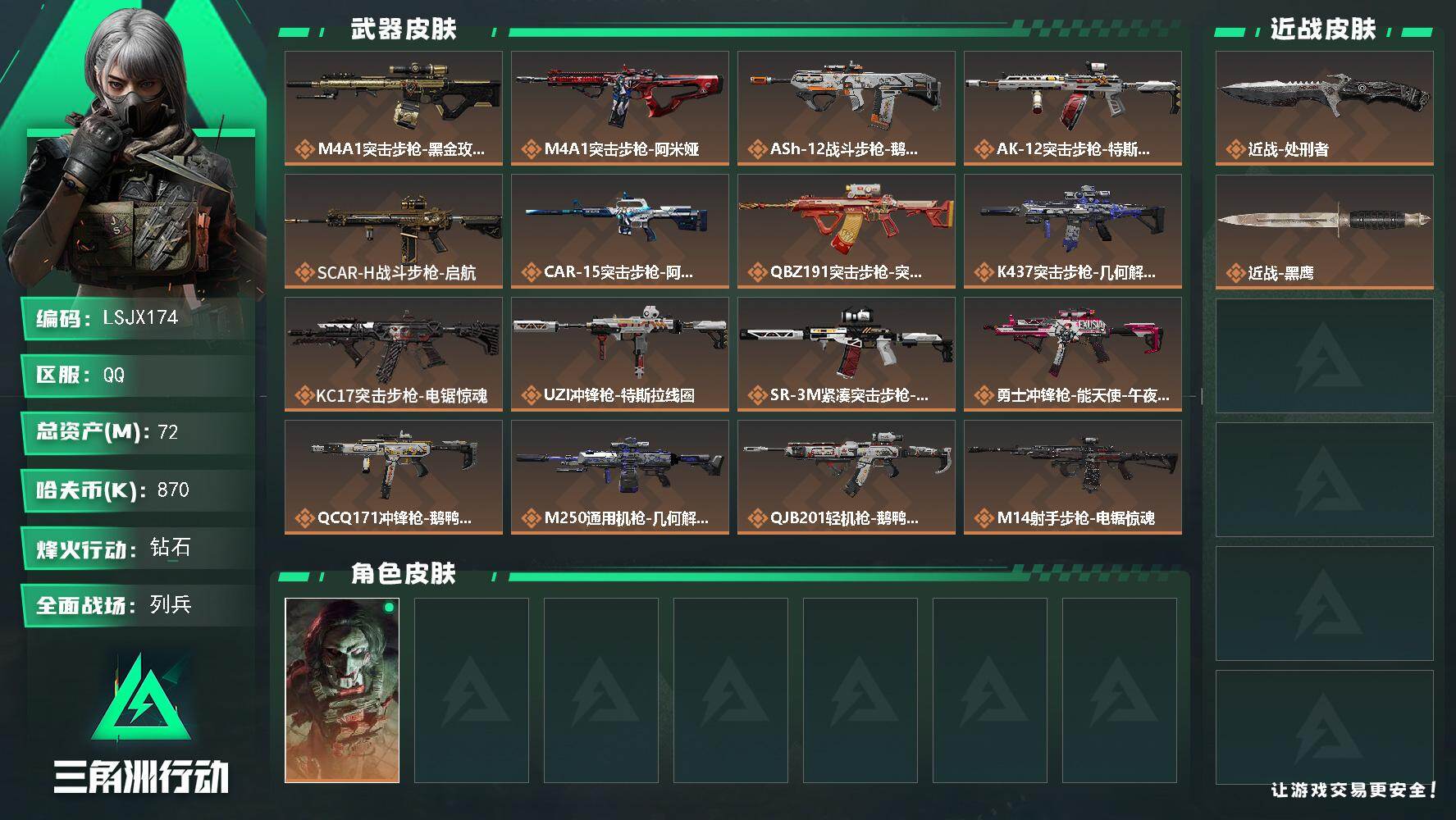 [16544283]【特价出售/店主推荐】72m总资产-870k哈伏币-60烽火等级-钻石-7战场等级-列兵 【干员外观】:红狼-电锯惊魂 【近战皮肤】:近战-处刑者,近战-黑鹰 【传说外观】:M4A1突击步枪-蚀金玫瑰,M4A1突击步枪-阿米娅,ASh-12战斗步枪-鹅鸭杀,AK-12突击步枪-特斯拉线圈,SCAR-H战斗步枪-启航,CAR-15突击步枪-阿米娅,腾龙突击步枪-捞点薯条,K437突击步枪-几何解构,KC17突击步枪-电锯惊魂,UZI冲锋枪-特斯拉线圈,SR-3M紧凑突击步枪-特斯拉线圈,勇士冲锋枪-能天使-午夜邮差,QCQ171冲锋枪-鹅鸭杀,M250通用机枪-几何解构,QJB201轻机枪-鹅鸭杀,M14射手步枪-电锯惊魂,SKS射手步枪-骑士,SR-9射手步枪-几何解构,AWM狙击步枪-捞点薯条,93R-捞点薯条,复合弓-黑·天际线 【史诗外观】:K416突击步枪-冬日风情,M16A4突击步枪-竞赛选手,AUG突击步枪-蝮蛇,SCAR-H战斗步枪-囚徒,MP5冲锋枪-战术竞备,MP5冲锋枪-竞技风,SR-3M紧凑突击步枪-战术竞备,勇士冲锋枪-工业狂潮,S12K霰弹枪-曙光,M250通用机枪-囚徒,QJB201轻机枪-炽焰,SVD狙击步枪-阿萨拉工艺,SV-98狙击步枪-林中猎手,SV-98狙击步枪-猎鳄行动,M700狙击步枪-竞技风 【稀有外观】:AKM突击步枪-肃杀,QBZ95-1突击步枪-公平竞技,K416突击步枪-一帆风顺,M7战斗步枪-前沿科技,M7战斗步枪-捣蛋鬼,SG552突击步枪-2026,SG552突击步枪-贴花艺术,SCAR-H战斗步枪-荣耀列队,腾龙突击步枪-前沿科技,腾龙突击步枪-冰天雪地,MP5冲锋枪-弄臣,MP5冲锋枪-虎啸,MP5冲锋枪-哈夫克卫队,P90冲锋枪-黄昏,P90冲锋枪-捣蛋鬼,Vector冲锋枪-先锋,UZI冲锋枪-亚特兰蒂斯,野牛冲锋枪-前沿科技,SMG-45-行动开启,SMG-45冲锋枪-幻影结构,SMG-45冲锋枪-天网,勇士冲锋枪-前沿科技,勇士冲锋枪-冰天雪地,M1014霰弹枪-幻影结构,M249轻机枪-冰天雪地,M250通用机枪-前沿科技,QJB201轻机枪-哈夫克卫队,Mini-14射手步枪-荣耀列队,SKS射手步枪-弄臣,SR-9射手步枪-街头涂鸦,G18-前沿科技,G18-星链科技,G18-哈夫克航天