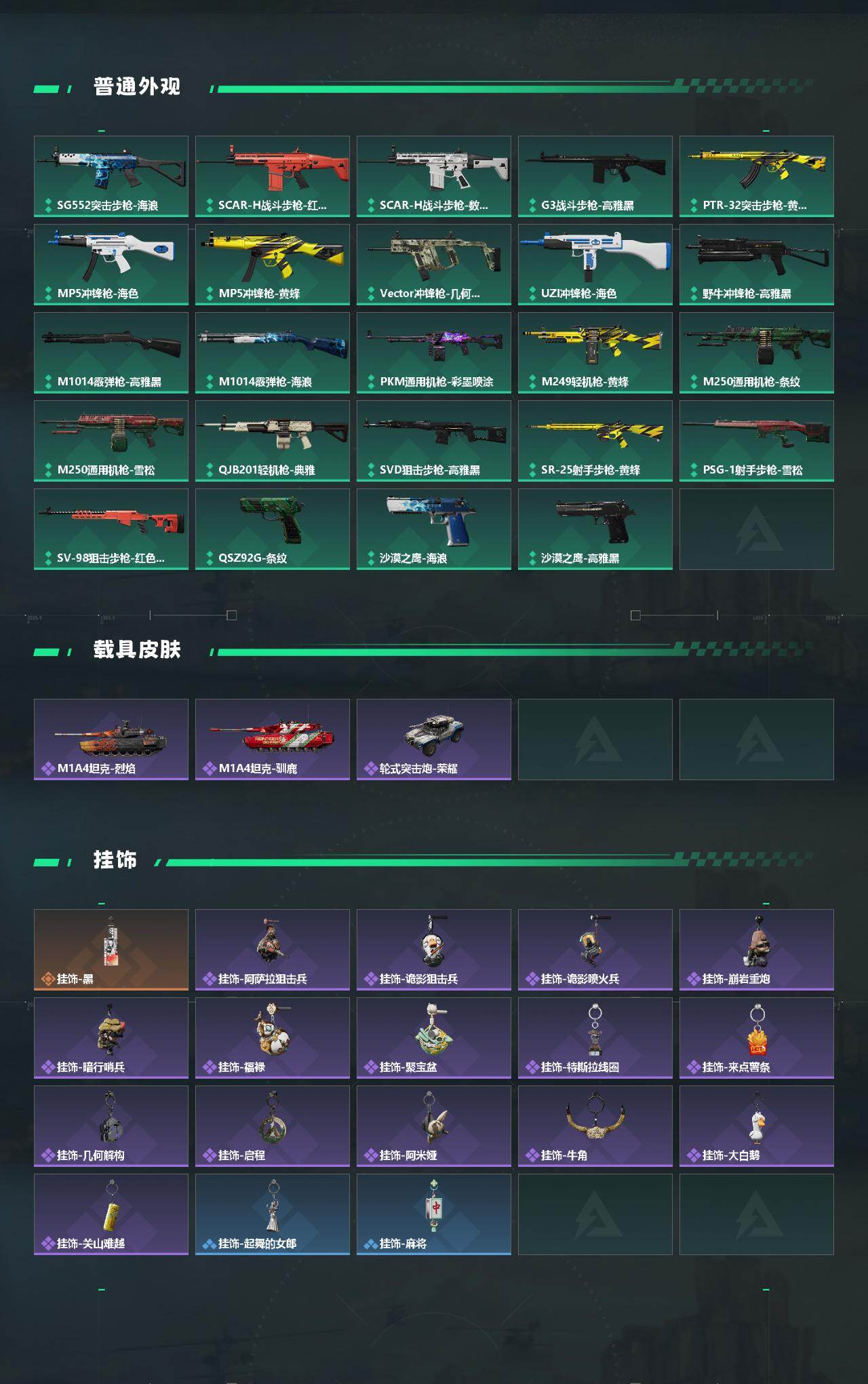 【稀有外观】:AKM突击步枪-肃杀,QBZ95-1突击步枪-公平竞技,K416突击步枪-一帆风顺,M7战斗步枪-前沿科技,M7战斗步枪-捣蛋鬼,SG552突击步枪-2026,SG552突击步枪-贴花艺术,SCAR-H战斗步枪-荣耀列队,腾龙突击步枪-前沿科技,腾龙突击步枪-冰天雪地,MP5冲锋枪-弄臣,MP5冲锋枪-虎啸,MP5冲锋枪-哈夫克卫队,P90冲锋枪-黄昏,P90冲锋枪-捣蛋鬼,Vector冲锋枪-先锋,UZI冲锋枪-亚特兰蒂斯,野牛冲锋枪-前沿科技,SMG-45-行动开启,SMG-45冲锋枪-幻影结构,SMG-45冲锋枪-天网,勇士冲锋枪-前沿科技,勇士冲锋枪-冰天雪地,M1014霰弹枪-幻影结构,M249轻机枪-冰天雪地,M250通用机枪-前沿科技,QJB201轻机枪-哈夫克卫队,Mini-14射手步枪-荣耀列队,SKS射手步枪-弄臣,SR-9射手步枪-街头涂鸦,G18-前沿科技,G18-星链科技,G18-哈夫克航天