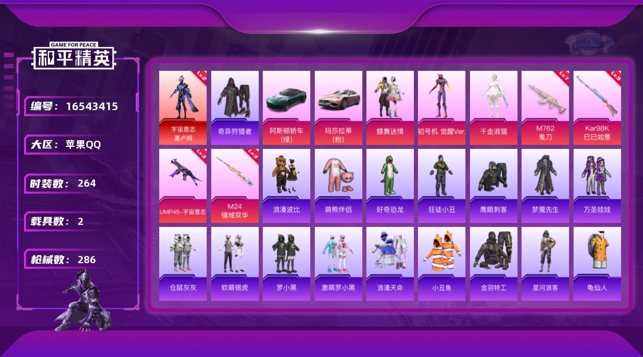 [16543415]苹果 手Q-1神装-3粉装-4特效枪-2载具-5粉色飞行器-91505热力值-22王牌印记-264套装-286枪皮【红色神装等级】:宇宙意志-塞卢姆(二级)【红色角色神装】:宇宙意志-塞卢姆【热门品类】:套装-浪漫天命,套装-小丑鱼,套装-奇异狩猎者,套装-金羽特工,套装-星河浪客,套装-SS1特训,套装-龟仙人,套装-暗影哥特,套装-浪漫波比,套装-萌熊伴侣,角色-8号机,角色-Mark.06,熔岩游骑兵连帽夹克【粉色套装】:粉装-蝶舞迷情,角色-初号机 觉醒Ver.,角色-千金淑猫【粉色枪皮等级】:M762-鬼刀(七级),UMP45-宇宙意志(三级),Kar98K-巳巳如意(五级),M24-镜域双华(三级)【粉色载具】:阿斯顿马丁DBS(绿),玛莎拉蒂Ghibli(粉)【粉色枪皮】:M762-鬼刀,UMP45-宇宙意志,Kar98K-巳巳如意,M24-镜域双华【粉色飞行器】:镜域双华-灵镜之阶,深渊漩涡飞行器,万象金身飞行器,圣域金龙飞行器