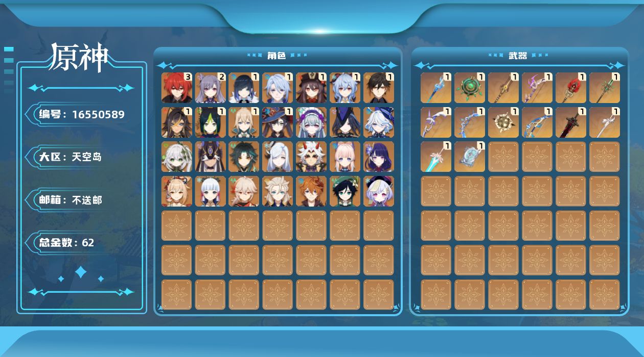 [16550589]60级/62黄/女主/28个五星角色/20个五星武器
