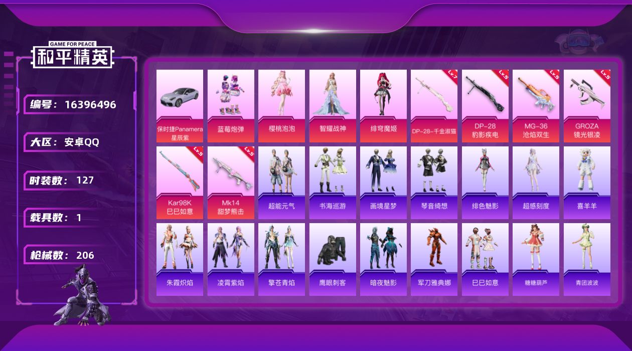 [16396496]安卓 手Q-4粉装-6特效枪-1载具-2粉色飞行器-56252热力值-6王牌印记-127套装-206枪皮 【热门品类】:角色-军刀雅典娜 【粉色套装】:粉装-蓝莓炮弹,角色-樱桃泡泡,角色-智耀战神,角色-绯穹魔姬 【粉色枪皮等级】:GROZA-镜光银凌(五级),Kar98K-巳巳如意(五级),Mk14-甜梦熊击(五级),DP-28-千金淑猫(七级),DP-28-豹影疾电(五级),MG-36-沧焰双生(五级) 【粉色载具】:保时捷Panamera(星辰紫) 【粉色枪皮】:GROZA-镜光银凌,Kar98K-巳巳如意,Mk14-甜梦熊击,DP-28-千金淑猫,DP-28-豹影疾电,MG-36-沧焰双生 【粉色飞行器】:极意拳锋飞行器 【粉色降落伞】:绝对恒星降落伞,春暖花开降落伞,筑梦精灵降落伞,沙丘之主降落伞,金丰海韵降落伞,千金淑猫降落伞,樱桃泡泡降落伞,智耀战神降落伞,喜羊羊与灰太狼降落伞,炫彩糖果降落伞,霁蓝缠春降落伞 【稀有套装】:套装-巳巳如意,套装-超能元气,角色-超感刻度,套装-雪国风尚,套装-炫彩糖果,套装-糖糖葫芦,套装-青团波波,套装-棉花软糖,角色-都市丽猫,角色-许七安,套装-燕燕于飞,套装-鱼渊荷华,角色-糖霜甜心,套装-粉恋花,套装-紫幽梦,套装-蓝冰羽,套装-星影赞美诗,套装-极速光影,套装-彩虹兔,套装-云朵鹅,套装-雪绒豹,角色-灵公主,套装-蜜露汐语,套装-朱霞炽焰,套装-凌霄紫焰,套装-擎苍青焰,玩偶服-喜羊羊,角色-绯色魅影,套装-书海巡游,套装-画境星梦,套装-琴音绮想,角色-馥郁金蕊,角色-碧青流霞 【稀有枪皮】:AUG-冰晶雪宝,AKM-夜灯,AKM-彩虹符号,AKM-生命誓言,AKM-破晓战魂,AKM-萌趣颜团子,AKM-虎虎生威,AKM-龙的传人,M16A4-幻世战舞者,M16A4-红色方程式,M16A4-蓝色火焰,M16A4-千金淑猫,SCAR-L-夜灯,SCAR-L-炫彩节奏,SCAR-L-碧影闪光,SCAR-L-红色方程式,M416-夜灯,M416-红色方程式,M416-蓝色火焰,GROZA-异彩先驱,GROZA-彩虹符号,GROZA-影袭,GROZA-治愈之星,AUG-甜蜜菠萝,AUG-耀粉歌者,QBZ-彩虹符号,QBZ-洛神天依,QBZ-飞驰魅影,M762-天降萌叽,M762-瑞龙福将,M762-云朵鹅,