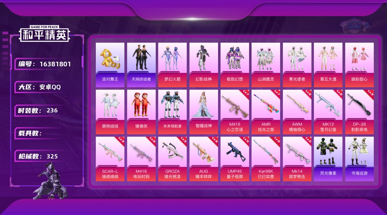 [16381801]安卓 手Q-11粉装-13特效枪-0载具-11粉色飞行器-104921热力值-17王牌印记-236套装-325枪皮