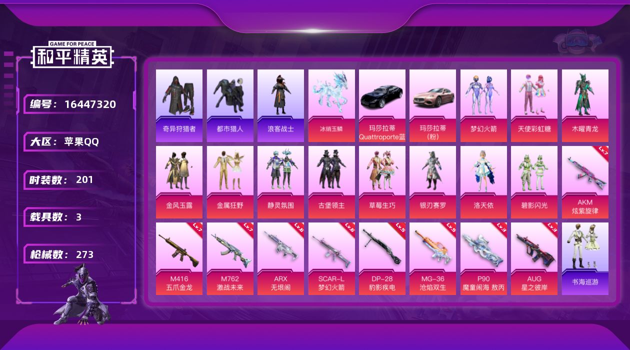 [16447320]苹果 手Q-11粉装-10特效枪-3载具-7粉色飞行器-95185热力值-13王牌印记-201套装-273枪皮