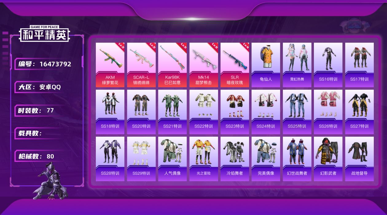 [16473792]安卓 手Q-0粉装-5特效枪-0载具-0粉色飞行器-24273热力值-11王牌印记-77套装-80枪皮 【热门品类】:套装-龟仙人 【粉色枪皮等级】:AKM-绿萝繁花(五级),SCAR-L-锦绣绵绵(五级),Kar98K-巳巳如意(五级),Mk14-甜梦熊击(五级),SLR-暗夜玫瑰(四级) 【粉色枪皮】:AKM-绿萝繁花,SCAR-L-锦绣绵绵,Kar98K-巳巳如意,Mk14-甜梦熊击,SLR-暗夜玫瑰 【粉色降落伞】:齐天大圣降落伞,炫光之旅降落伞,圣堂之誓降落伞,冷漠罗丽降落伞 【稀有套装】:套装-龟仙人,套装-霓虹热舞 【稀有枪皮】:AKM-彩虹符号,AKM-生命誓言,AKM-破晓战魂,AKM-萌趣颜团子,AKM-虎虎生威,AKM-霓虹街区,AKM-龙的传人,M16A4-幻世战舞者,M16A4-红色方程式,M16A4-蓝色火焰,SCAR-L-玉兔迎春,SCAR-L-红色方程式,M416-糯团青竹,M416-红色方程式,M416-绯红前夜,M416-蓝色火焰,GROZA-彩虹符号,AUG-天降萌叽,AUG-耀粉歌者,QBZ-彩虹符号,M762-天降萌叽,G36C-暗夜玫瑰,AC-VAL-天降萌叽,蜜獾-天降萌叽,UZI-啾咪啾咪,UZI-天降萌叽,UZI-炫彩节奏,UZI-红色方程式,UMP45-涂山之恋,UMP45-蓝色火焰,Vector-生命誓言,汤姆逊-炫彩节奏,汤姆逊-耀粉歌者,Kar98K-彩虹符号,Kar98K-红色方程式,Mini14-耀粉歌者,SLR-彩虹符号,S686-彩虹符号,S686-红色方程式,S1897-炫彩节奏,S12K-破晓战魂,DBS-彩虹符号,DBS-荧海星豚,M249-破晓战魂,MG3-幻世战舞者,TMP-9-未来歌姬 【其他套装】:套装-SS16特训,套装-SS17特训,套装-SS18特训,套装-SS20特训,套装-SS21特训,套装-SS22特训,套装-SS23特训,套装-SS24特训,套装-SS25特训,套装-SS26特训,套装-SS27特训,套装-SS28特训,套装-SS29特训,套装-人气偶像,套装-光之冒险,套装-冷焰舞者,套装-完美偶像,套装-幻世战舞者,套装-幻影武者,套装-战地督导,套装-极速红龙,套装-橘黑制服,套装-活力之心,套装-海岛探路者,套装-深蓝色名流,套装-湖蓝色名流,套装-滨海假日,套装