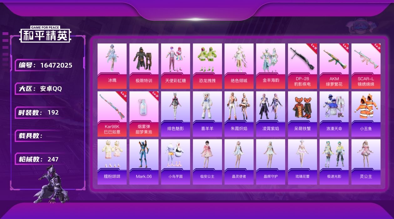 [16472025]安卓 手Q-6粉装-5特效枪-0载具-6粉色飞行器-74782热力值-16王牌印记-192套装-247枪皮