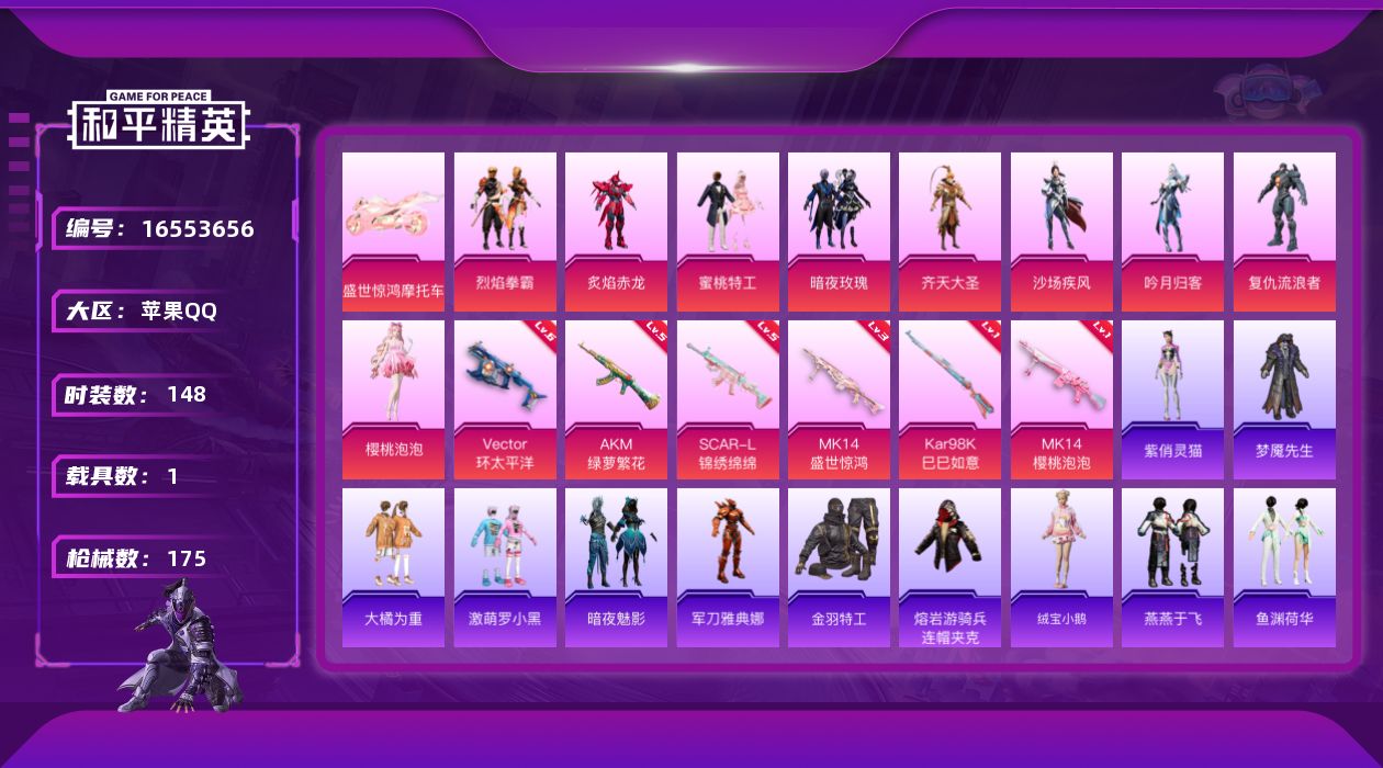 [16553656]苹果 手Q-9粉装-6特效枪-1载具-3粉色飞行器-56517热力值-3王牌印记-148套装-175枪皮