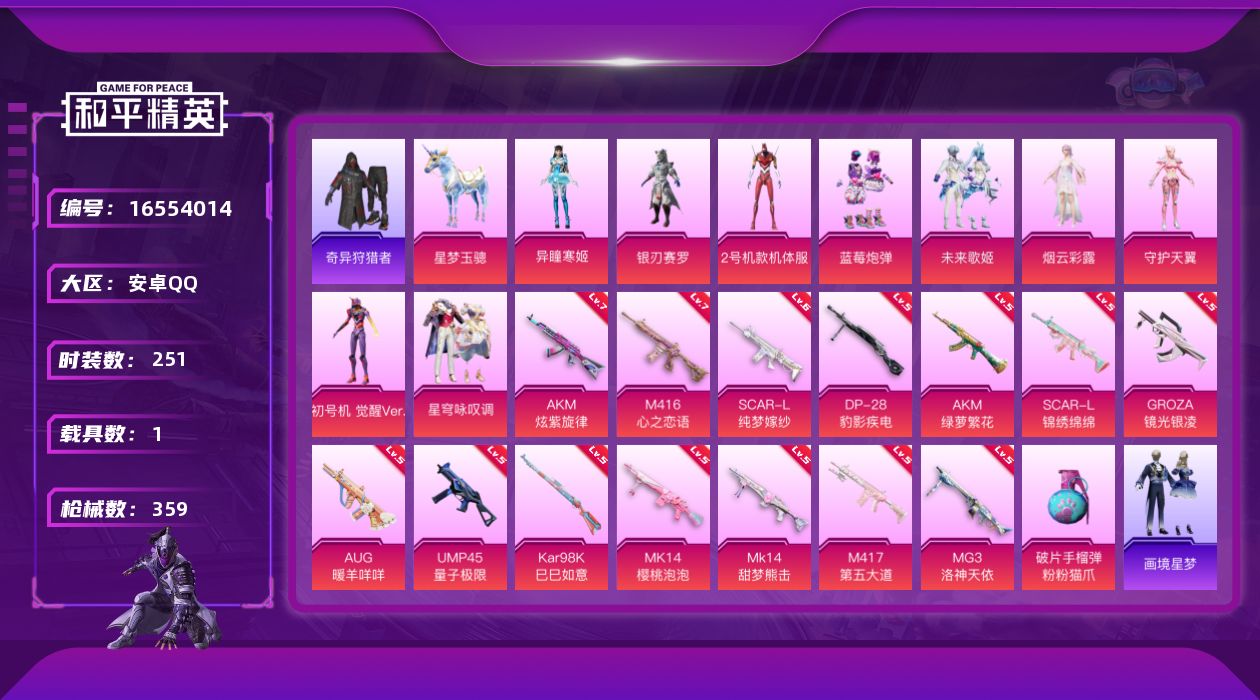 [16554014]安卓 手Q-9粉装-15特效枪-1载具-2粉色飞行器-114089热力值-21王牌印记-251套装-359枪皮 【热门品类】:套装-浪漫天命,套装-小丑鱼,套装-奇异狩猎者,套装-龟仙人,套装-潮萌小黄鸭,套装-浪漫波比,套装-粉红小猪 【粉色套装】:粉装-银刃赛罗,角色-2号机款机体服,粉装-蓝莓炮弹,粉装-未来歌姬,角色-烟云彩露,角色-守护天翼,角色-初号机 觉醒Ver.,粉装-星穹咏叹调,角色-异瞳寒姬 【粉色枪皮等级】:AKM-炫紫旋律(七级),AKM-绿萝繁花(五级),SCAR-L-纯梦嫁纱(六级),SCAR-L-锦绣绵绵(五级),M416-心之恋语(七级),GROZA-镜光银凌(五级),AUG-暖羊咩咩(五级),UMP45-量子极限(五级),Kar98K-巳巳如意(五级),Mk14-樱桃泡泡(五级),Mk14-甜梦熊击(五级),M417-第五大道(五级),DP-28-豹影疾电(五级),MG3-洛神天依(五级) 【粉色载具】:星梦玉骢 【粉色枪皮】:AKM-炫紫旋律,AKM-绿萝繁花,SCAR-L-纯梦嫁纱,SCAR-L-锦绣绵绵,M416-心之恋语,GROZA-镜光银凌,AUG-暖羊咩咩,UMP45-量子极限,Kar98K-巳巳如意,Mk14-樱桃泡泡,Mk14-甜梦熊击,M417-第五大道,DP-28-豹影疾电,MG3-洛神天依,破片手榴弹-粉粉猫爪 【粉色飞行器】:精灵迷巫飞行器,镜域双华-灵镜之阶 【粉色降落伞】:快乐主宰降落伞,精灵迷巫降落伞,神秘黑猫降落伞,古堡领主降落伞,葫芦兄弟降落伞,洛神天依降落伞,恐龙拽拽降落伞,筑梦精灵降落伞,垂柳戏鸭降落伞,暗夜鎏金降落伞,圣堂之誓降落伞,猪猪侠降落伞,镜域双华降落伞,初号机 觉醒Ver.降落伞,金丰海韵降落伞,千金淑猫降落伞,临安公主降落伞,智耀战神降落伞,星穹咏叹调降落伞,喜羊羊与灰太狼降落伞,炫彩糖果降落伞 【稀有套装】:套装-龟仙人,套装-巳巳如意,套装-雪国风尚,套装-雏菊兔兔,套装-萝兰蝴蝶,套装-小熊娃娃,套装-糖糖葫芦,套装-青团波波,套装-棉花软糖,角色-摩登魅猫,套装-燕燕于飞,套装-鱼渊荷华,角色-糖霜甜心,角色-蜜桃派对,套装-粉恋花,套装-紫幽梦,套装-蓝冰羽,套装-星渊小夜曲,套装-云朵鹅,套装-雪绒豹,角色-灵公主,角色-绯色魅影,套装-画境星梦,套装-琴音绮想 【稀