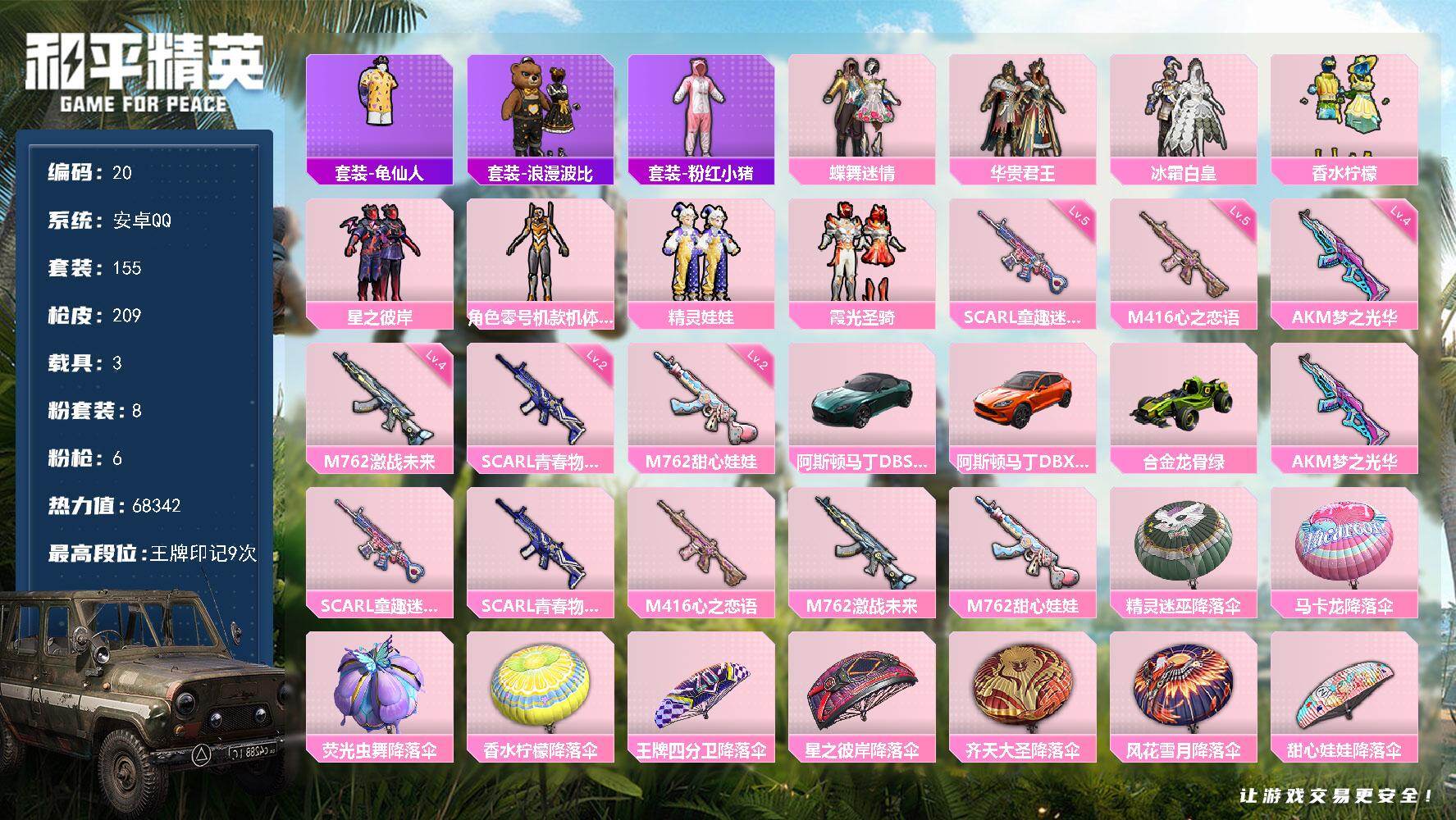 [16554354]安卓 手Q-8粉装-6特效枪-3载具-0粉色飞行器-68342热力值-9王牌印记-155套装-209枪皮