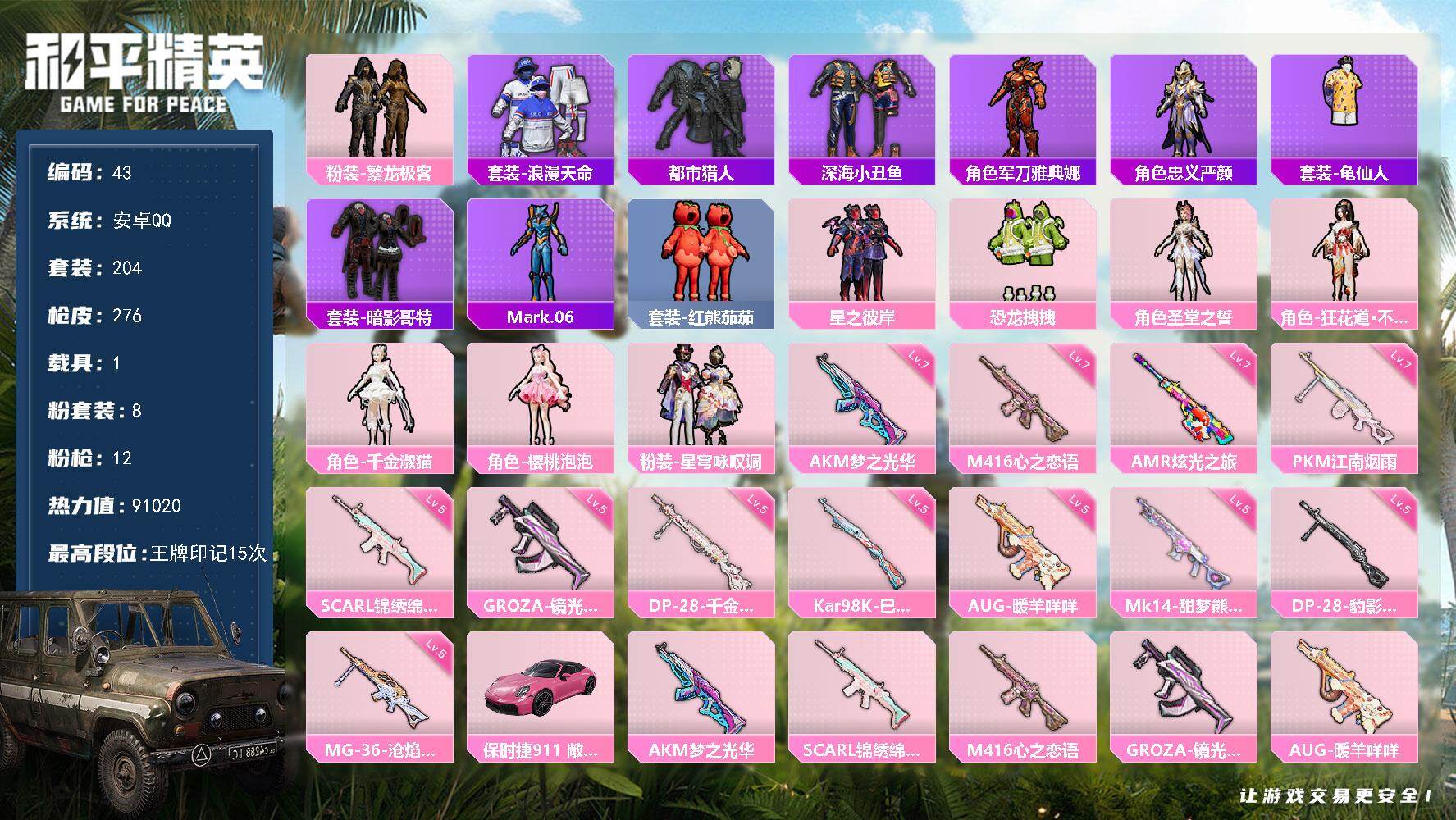 [16555445]安卓 手Q-8粉装-12特效枪-1载具-6粉色飞行器-91020热力值-15王牌印记-204套装-276枪皮