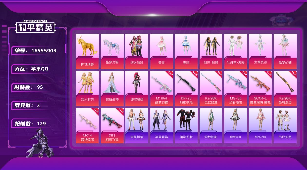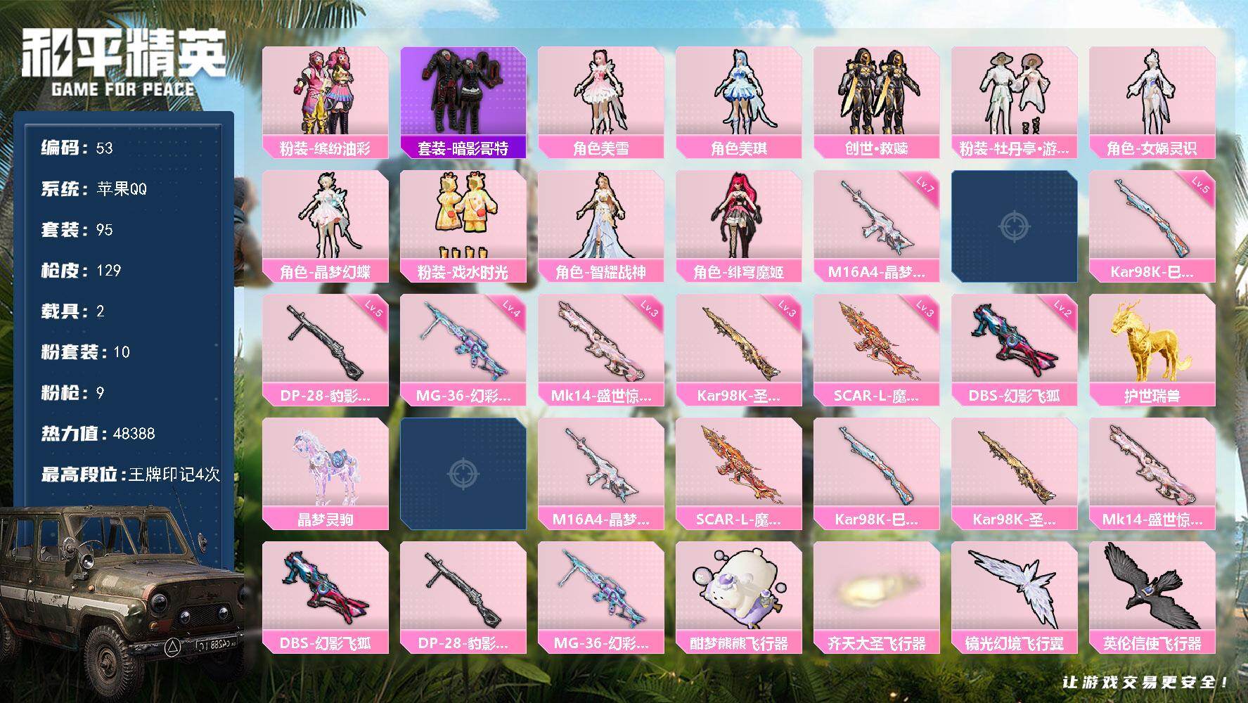 [16555903]苹果 手Q-10粉装-9特效枪-2载具-14粉色飞行器-48388热力值-4王牌印记-95套装-129枪皮