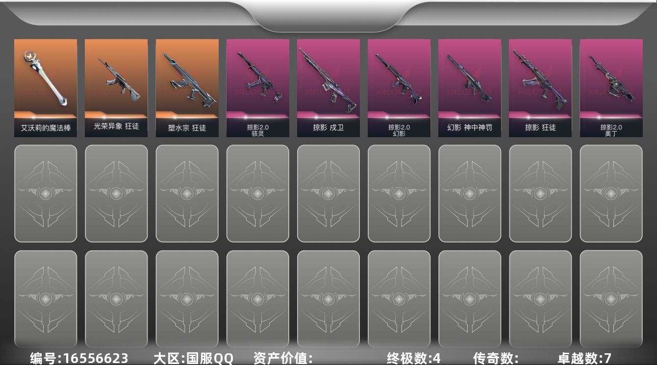 [16556623]【套装】:掠影//3.0套装,回火礼包:掠影套装 【英雄】:炼狱,捷风,不死鸟,贤者,猎枭,盖可 【近战武器】:近战武器-影蝶,近战武器-艾沃莉的魔法棒 【狂徒】:狂徒-塑水宗,狂徒-光荣异象,狂徒-掠影 【幻影】:幻影-神中神罚,幻影-掠影//2.0 【戍卫】:戍卫-掠影 【奥丁】:奥丁-掠影//2.0 【骇灵】:骇灵-掠影//2.0 【追猎】:追猎-掠影//3.0 【标配】:标配-神罚 【卡面】:代号红色 卡面,新兵报到 卡面,V契约 卡面,无畏契约 卡面 【喷漆】:胜利属于无畏契约 喷漆,GLHF 喷漆,无畏契约 喷漆 【挂饰】:无畏契约 纪念币 挂饰