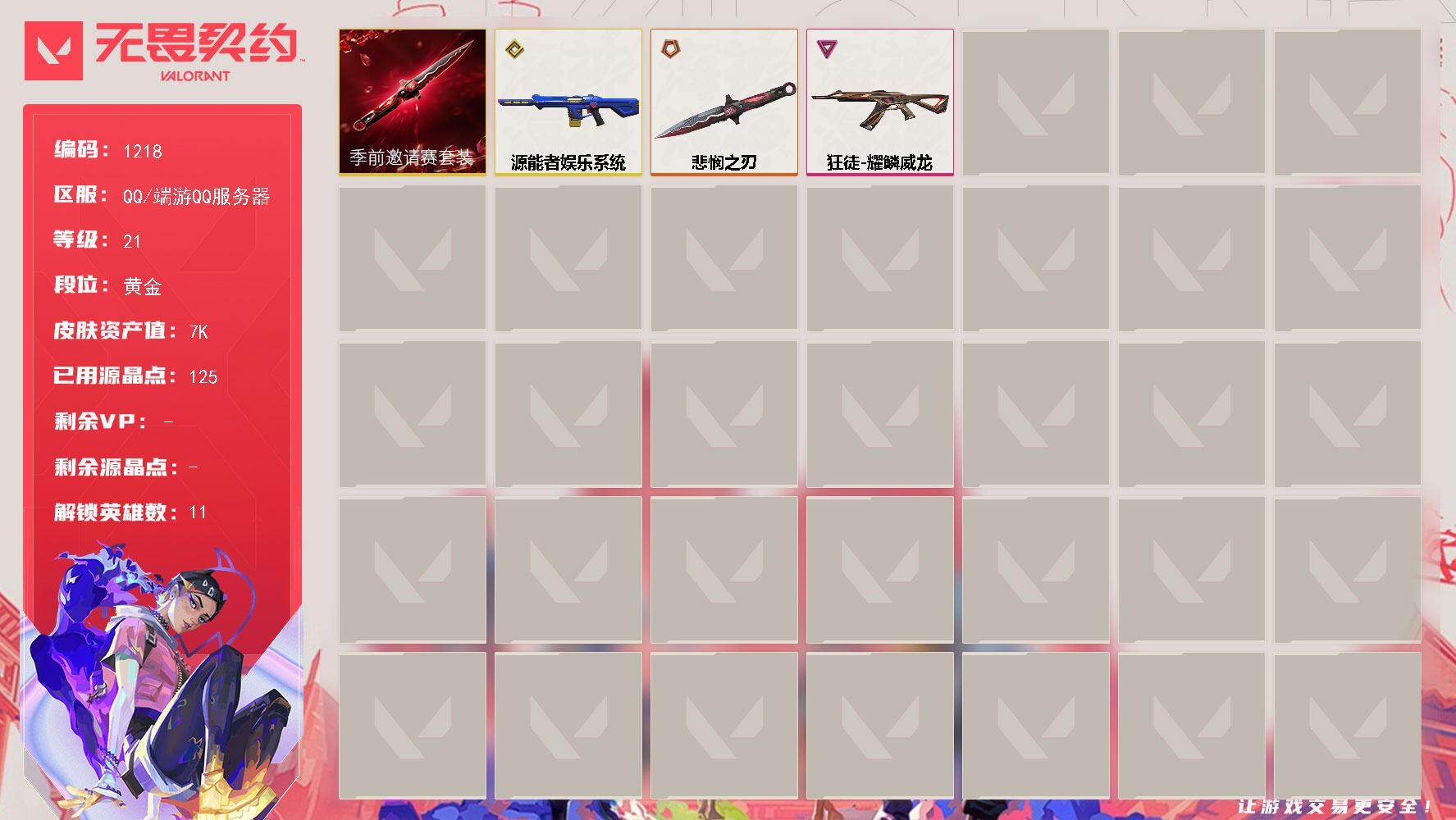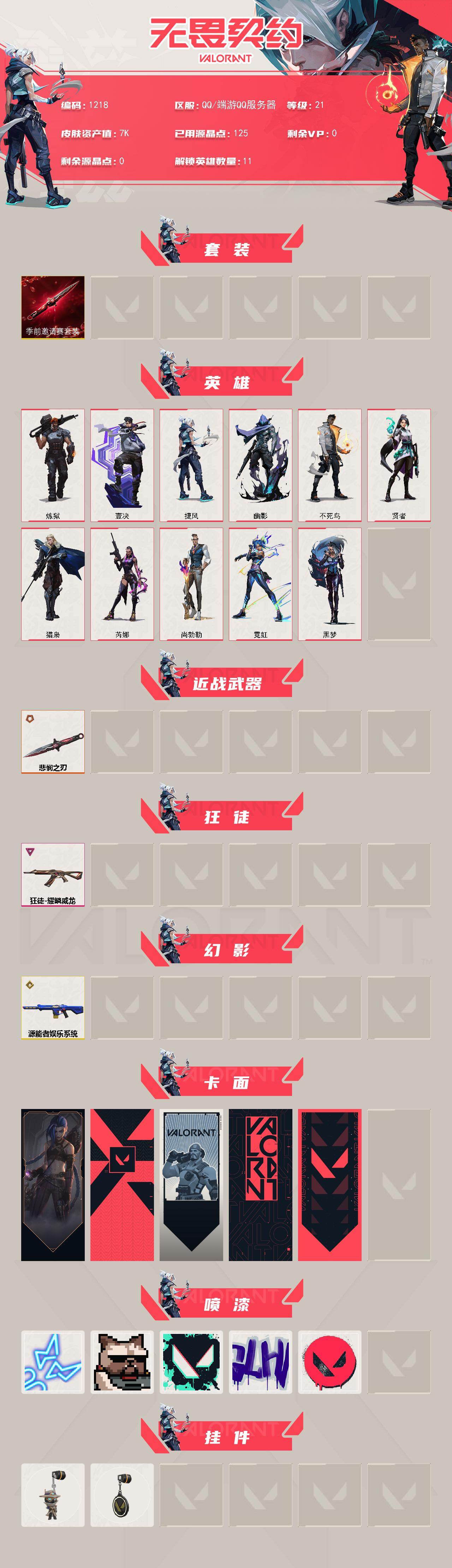 [16556693]【套装】:无畏契约季前邀请赛套装 【英雄】:炼狱,壹决,捷风,幽影,不死鸟,贤者,猎枭,芮娜,尚勃勒,霓虹,黑梦 【近战武器】:近战武器-无畏契约季前邀请赛 悲悯之刃 【狂徒】:狂徒-耀鳞威龙 【幻影】:幻影-源能者娱乐系统 【卡面】:《双城之战》金克丝 卡面,代号红色 卡面,新兵报到 卡面,V契约 卡面,无畏契约 卡面 【喷漆】:霓光四射 喷漆,关门放狗 喷漆,胜利属于无畏契约 喷漆,GLHF 喷漆,无畏契约 喷漆 【挂饰】:无畏契约GO!第一卷 零 挂饰,无畏契约 纪念币 挂饰
