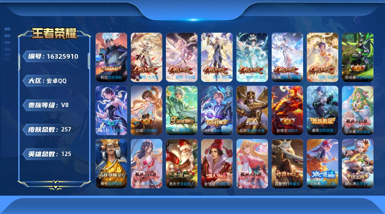 [16325910]安卓Q-V7-荣耀黄金I段位-125英雄-257皮肤-1典藏皮肤-15传说-57史诗