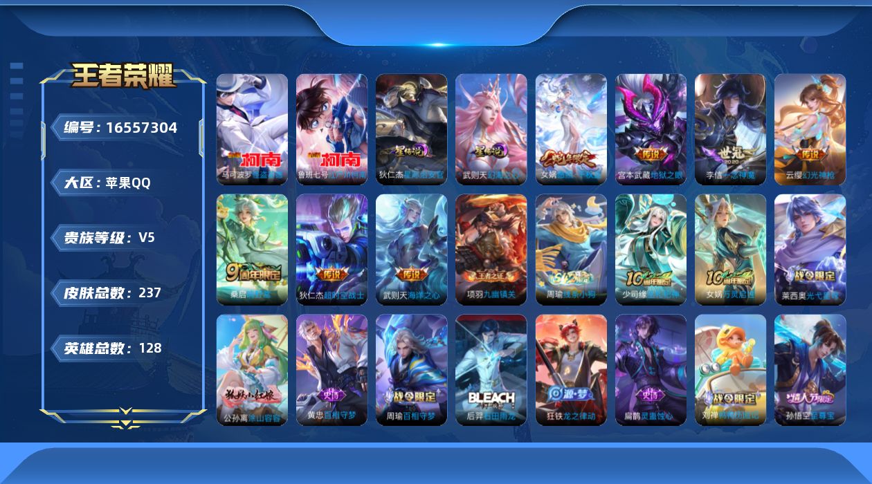 [16557304]苹果Q--237皮肤-1典藏英雄-2珍品传说-10传说-82史诗