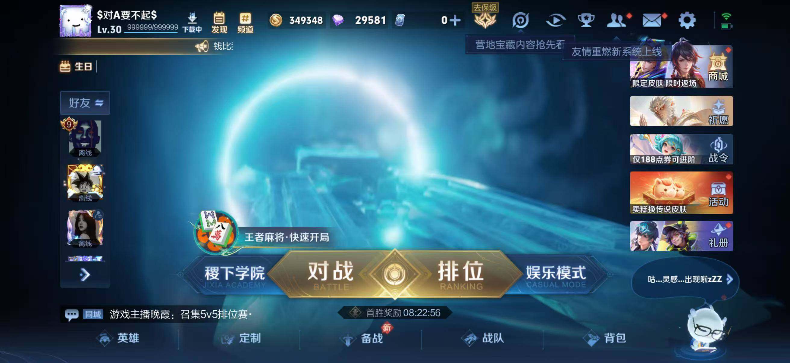 - [11656596]V8 6传说 124英雄 209皮肤 可修改实名 优质装备:黄金狮子座,地狱火,地狱之眼,涂山容容 珍宝阁皮:妄想食味,优雅恋人 限定皮:至尊宝,白虎志(电光耗子),凤求凰(白切鸡),梅西,神威(电光马子),飞衡(韩信年限),遇见飞天,冰锋战神,梁祝,御风骁将(吕布年限),天狼狩猎者,李小龙,逐梦之影,朱雀志(守约年限),大圣娶亲,青春决赛季,冰霜恋舞曲,神奇女侠 史诗皮:星界战将,百相守梦-周瑜,百相守梦-黄忠,紫霞仙子,苍穹之光,白龙吟,千年之狐,江河有灵,蒙恬荣光圣徽,电玩·爆裂旋风,末日机甲-吕布,乱世虎臣,修罗,摇滚巨星,水果甜心,星夜王子,暗隐猎兽者,幽灵船长,鬼剑武藏,心灵战警,舞动绿茵,繁星吟游(呼啦呼啦),乘风破浪,逐浪之夏,水晶猎龙者,金属风暴,原初追逐者,鹰眼统帅,黎明之约,未来纪元-赵云