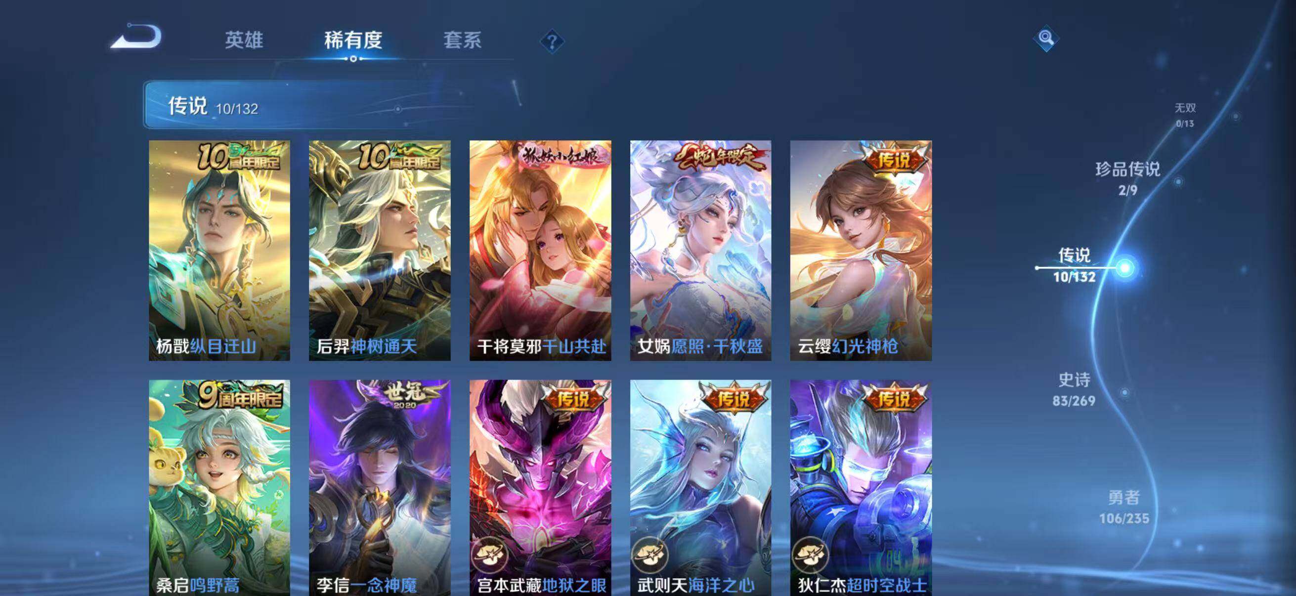 【传说皮肤】:杨戬纵目迁山,后羿神树通天,干将莫邪千山共赴,女娲愿照千秋盛,云缨幻光神枪,桑启鸣野蒿,李信一念神魔,宫本武藏地狱之眼,武则天海洋之心,狄仁杰超时空战士