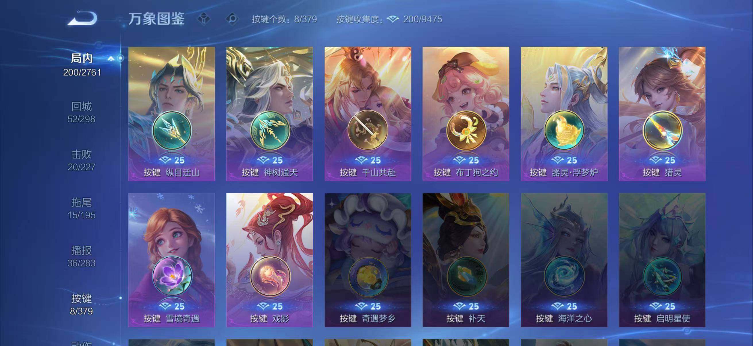 瑶遇见神鹿,伽罗箭羽风息,李元芳逐浪之夏,不知火舞魅语,公孙离无限星赏官,大乔猫狗日记,阿轲节奏热浪,露娜紫霞仙子,王昭君偶像歌手,项羽苍穹之光,雅典娜冰冠公主,吕布末日机甲,鲁班七号电玩小子,橘右京修罗,嬴政摇滚巨星,刘禅绅士熊喵,刘禅天才门将,白起星夜王子,安琪拉心灵骇客,程咬金功夫厨神,刘邦德古拉伯爵,兰陵王暗隐猎兽者,曹操幽灵船长,宫本武藏鬼剑武藏,亚瑟心灵战警,杨戬天秀·启明,廉颇地狱岩魂,小乔缤纷独角兽,夏侯惇乘风破浪,花木兰水晶猎龙者,墨子金属风暴,百里玄策原初追逐者,吕布圣诞狂欢,百里守约特工魅影,雅典娜黎明之约,李白千年之狐,刘禅电玩·爆裂旋风,蒙犽百解令,周瑜雪夜绮愿,赵怀真器灵·浮梦炉