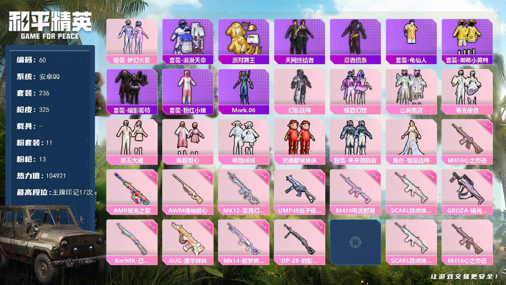 [16557383]安卓 手Q-11粉装-13特效枪-0载具-11粉色飞行器-104921热力值-17王牌印记-236套装-325枪皮