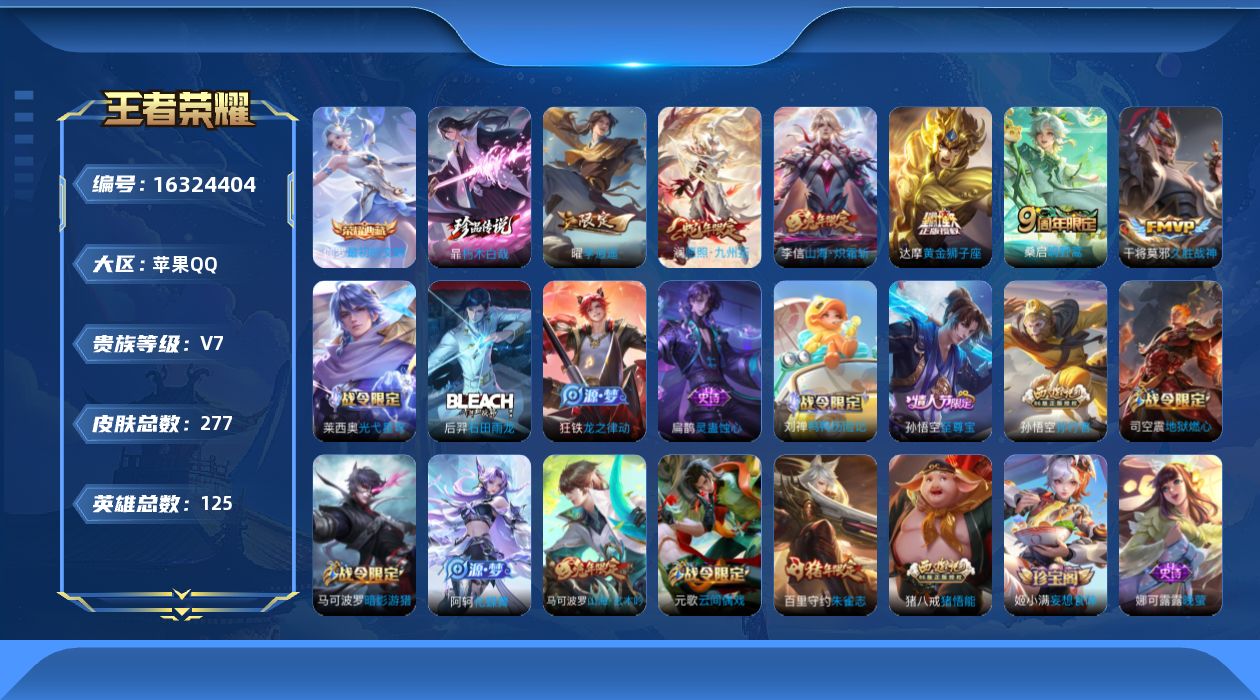 [16324404]苹果Q-1典藏皮肤-1珍品传说-6传说-85史诗 【英雄全皮】:猪八戒全皮,蒙恬全皮 【荣耀典藏】:伽罗最初的交响 【珍品传说】:暃朽木白哉 【传说皮肤】:澜愿照九州拓,桑启鸣野蒿,李信山海炽霜斩,曜李逍遥 ,干将莫邪久胜战神,达摩黄金狮子座 【限定皮肤】:蒙犽顽岩魄,蔡文姬夏日便利店,虞姬夏日便利店,姜子牙天穹之誓,杨戬破阵退雄兵,狄仁杰阴阳师,赵云皇家上将,孙尚香蔷薇恋人,庄周高山流水,高渐离玩趣恶龙,元歌云间偶戏,元歌无心,夏侯惇朔风刀,曹操烛龙,马可波罗暗影游猎,马可波罗山海玄木吟,狄仁杰魔术师,狄仁杰万华元夜,达摩沙漠行僧,项羽海滩派对,老夫子醍醐杖,程咬金演武夺筹,露娜一生所爱,王昭君午后时光,兰陵王金庭之子,花木兰瑞麟志,亚瑟潮玩骑士王,孙悟空至尊宝,孙悟空孙行者,李元芳云中旅人,钟馗驱傩正仪,雅典娜黎明之约,蔡文姬繁星吟游,太乙真人华丽摇滚,鬼谷子原初探秘者,鬼谷子五谷丰年,苏烈千军破阵,百里玄策原初追逐者,百里守约朱雀志,弈星混沌棋,梦奇顽趣,沈梦溪大漠名商,明世隐疑决卦,裴擒虎李小龙,裴擒虎擒涛扼浪,狂铁电玩高手,云中君纤云弄巧,李信山海炽霜斩,猪八戒西部大镖客,猪八戒猪悟能,上官婉儿梁祝,嫦娥拒霜思,嫦娥暖冬兔眠,曜李逍遥 ,鲁班大师探海日志,桑启海盐诗旅,暃星界游侠,司空震地狱燃心,张良古海寻踪,蒙犽百解令,蒙恬荣光圣徽,鬼谷子天穹祈灯,姬小满妄想食味,沈梦溪龙舞盛年,刘邦剑破天穹,程咬金群星魔术团,周瑜熔金海岸 【年限皮肤】:百里守约朱雀志,花木兰瑞麟志,马可波罗山海玄木吟,李信山海炽霜斩 【赛季限定】:夏侯惇朔风刀,曹操烛龙,狄仁杰万华元夜,达摩沙漠行僧,老夫子醍醐杖,程咬金演武夺筹,兰陵王金庭之子,张良古海寻踪,李元芳云中旅人,钟馗驱傩正仪,雅典娜黎明之约,鬼谷子原初探秘者,苏烈千军破阵,百里玄策原初追逐者,弈星混沌棋,梦奇顽趣,沈梦溪大漠名商,明世隐疑决卦,裴擒虎擒涛扼浪,鲁班大师探海日志,桑启海盐诗旅,鬼谷子天穹祈灯,蒙恬荣光圣徽,刘邦剑破天穹,姜子牙天穹之誓 【战令限定】:蔡文姬夏日便利店,虞姬夏日便利店,元歌云间偶戏,马可波罗暗影游猎,王昭君午后时光,亚瑟潮玩骑士王,狂铁电玩高手,猪八戒西部大镖客,嫦娥暖冬兔眠,司空震地狱燃心,暃星界游侠 【史诗皮肤】:露娜紫霞仙子,阿轲暗夜猫娘,赵云皇家上将,赵云未来纪元,貂蝉圣诞恋歌,甄姬