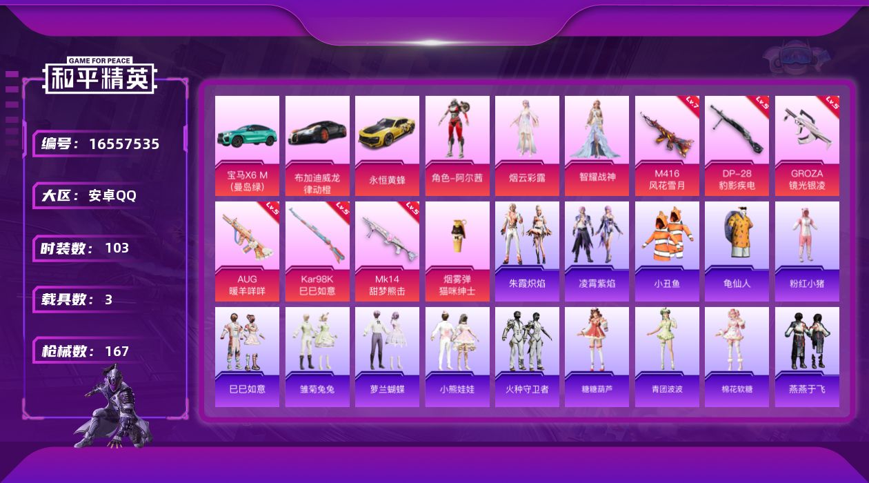 [16557535]安卓 手Q-3粉装-7特效枪-3载具-2粉色飞行器-52198热力值-6王牌印记-103套装-167枪皮
