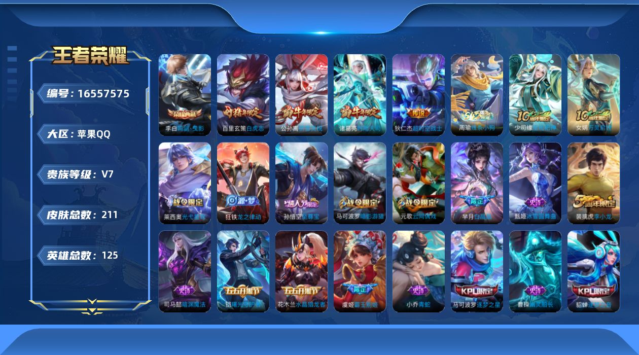[16557575]苹果Q--211皮肤-1典藏皮肤-4传说-45史诗 【荣耀典藏】:李白鸣剑曳影 【传说皮肤】:公孙离祈雪灵祝,诸葛亮时雨天司,百里玄策白虎志,狄仁杰超时空战士 【限定皮肤】:白起狰,蔡文姬夏日便利店,姜子牙天穹之誓,狄仁杰阴阳师,虞姬凯尔特女王,赵云皇家上将,墨子神迹守卫,嬴政优雅恋人,庄周蜃楼王,阿轲迷踪丽影,孙膑妖精王,扁鹊炼金王,芈月重明,芈月白晶晶,元歌云间偶戏,夏侯惇朔风刀,曹操烛龙,马可波罗逐梦之星,马可波罗暗影游猎,狄仁杰魔术师,狄仁杰万华元夜,达摩沙漠行僧,项羽海滩派对,老夫子醍醐杖,老夫子航海奇遇记,貂蝉逐梦之音,程咬金演武夺筹,刘邦夺宝奇兵,兰陵王金庭之子,亚瑟狮心王,亚瑟潮玩骑士王,孙悟空至尊宝,虞姬霸王别姬,钟馗驱傩正仪,雅典娜单词大作战,雅典娜黎明之约,蔡文姬繁星吟游,太乙真人饕餮,鬼谷子原初探秘者,诸葛亮时雨天司,苏烈千军破阵,百里玄策白虎志,百里玄策原初追逐者,弈星混沌棋,公孙离祈雪灵祝,沈梦溪大漠名商,明世隐疑决卦,裴擒虎李小龙,云中君纤云弄巧,盾山御銮,猪八戒西部大镖客,蒙犽狂想玩偶喵,鲁班大师探海日志,桑启海盐诗旅,张良古海寻踪,鬼谷子天穹祈灯,沈梦溪龙舞盛年,刘邦剑破天穹,周瑜熔金海岸 【年限皮肤】:百里玄策白虎志,公孙离祈雪灵祝,诸葛亮时雨天司 【赛季限定】:亚瑟狮心王,庄周蜃楼王,孙膑妖精王,扁鹊炼金王,虞姬凯尔特女王,白起狰,太乙真人饕餮,曹操烛龙,芈月重明,盾山御銮,夏侯惇朔风刀,弈星混沌棋,明世隐疑决卦,老夫子醍醐杖,鬼谷子原初探秘者,狄仁杰万华元夜,程咬金演武夺筹,钟馗驱傩正仪,苏烈千军破阵,达摩沙漠行僧,兰陵王金庭之子,沈梦溪大漠名商,桑启海盐诗旅,鲁班大师探海日志,张良古海寻踪,鬼谷子天穹祈灯,刘邦剑破天穹,姜子牙天穹之誓,太乙真人谧流熔炉,钟馗虚灵犬护,甄姬逆浪荇歌,亚瑟荣光之誓,百里玄策原初追逐者,雅典娜黎明之约 【战令限定】:阿轲迷踪丽影,刘邦夺宝奇兵,马可波罗暗影游猎,猪八戒西部大镖客,蒙犽狂想玩偶喵,雅典娜单词大作战,元歌云间偶戏,亚瑟潮玩骑士王,老夫子航海奇遇记,墨子神迹守卫,蔡文姬夏日便利店,莱西奥光弋星穹,明世隐往忆晖光,周瑜线条小狗 【史诗皮肤】:赵云皇家上将,甄姬冰雪圆舞曲,王昭君偶像歌手,狄仁杰魔术师,宫本武藏鬼剑武藏,孙尚香水果甜心,嬴政优雅恋人,嬴政暗夜贵公子,妲己魅力维加斯,墨子金属