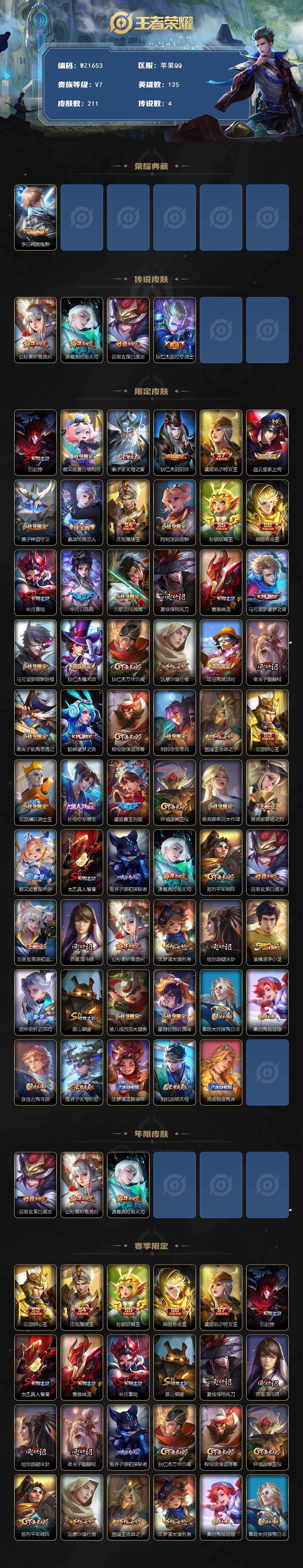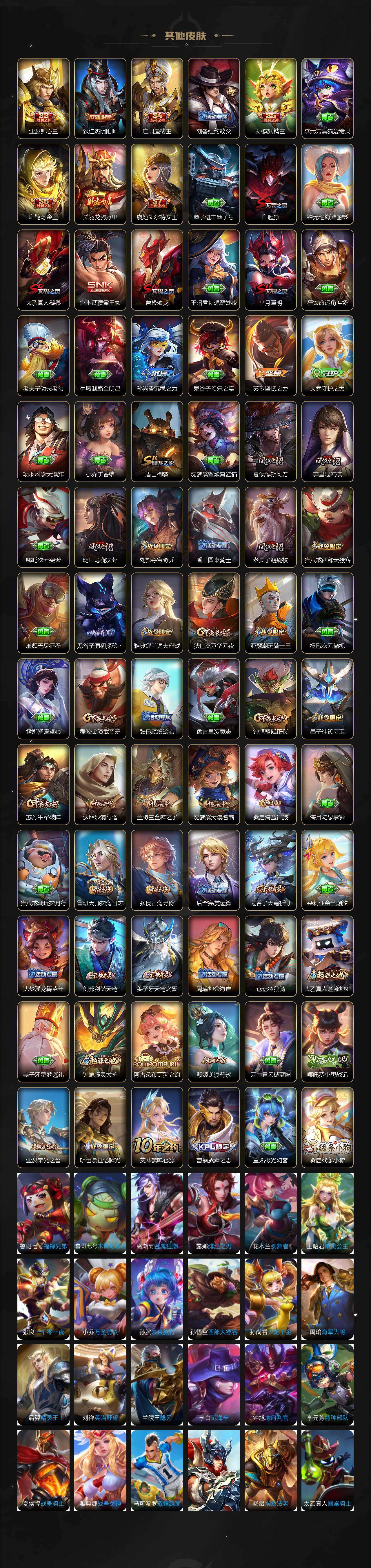 【限定皮肤】:白起狰,蔡文姬夏日便利店,姜子牙天穹之誓,狄仁杰阴阳师,虞姬凯尔特女王,赵云皇家上将,墨子神迹守卫,嬴政优雅恋人,庄周蜃楼王,阿轲迷踪丽影,孙膑妖精王,扁鹊炼金王,芈月重明,芈月白晶晶,元歌云间偶戏,夏侯惇朔风刀,曹操烛龙,马可波罗逐梦之星,马可波罗暗影游猎,狄仁杰魔术师,狄仁杰万华元夜,达摩沙漠行僧,项羽海滩派对,老夫子醍醐杖,老夫子航海奇遇记,貂蝉逐梦之音,程咬金演武夺筹,刘邦夺宝奇兵,兰陵王金庭之子,亚瑟狮心王,亚瑟潮玩骑士王,孙悟空至尊宝,虞姬霸王别姬,钟馗驱傩正仪,雅典娜单词大作战,雅典娜黎明之约,蔡文姬繁星吟游,太乙真人饕餮,鬼谷子原初探秘者,诸葛亮时雨天司,苏烈千军破阵,百里玄策白虎志,百里玄策原初追逐者,弈星混沌棋,公孙离祈雪灵祝,沈梦溪大漠名商,明世隐疑决卦,裴擒虎李小龙,云中君纤云弄巧,盾山御銮,猪八戒西部大镖客,蒙犽狂想玩偶喵,鲁班大师探海日志,桑启海盐诗旅,张良古海寻踪,鬼谷子天穹祈灯,沈梦溪龙舞盛年,刘邦剑破天穹,周瑜熔金海岸