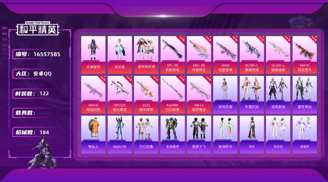 [16557585]安卓 手Q-3粉装-11特效枪-0载具-2粉色飞行器-57913热力值-18王牌印记-122套装-184枪皮 【热门品类】:套装-龟仙人,角色-Mark.06 【粉色套装】:粉装-天禅智恒,角色-洛天依,粉装-星穹咏叹调 【粉色枪皮等级】:AKM-炫紫旋律(五级),SCAR-L-青春物语(五级),SCAR-L-锦绣绵绵(五级),M416-风花雪月(五级),M416-电玩时刻(五级),GROZA-镜光银凌(五级),AUG-暖羊咩咩(五级),Kar98K-巳巳如意(五级),Mk14-甜梦熊击(五级),DP-28-豹影疾电(五级),MG-36-沧焰双生(五级) 【粉色枪皮】:AKM-炫紫旋律,SCAR-L-青春物语,SCAR-L-锦绣绵绵,M416-风花雪月,M416-电玩时刻,GROZA-镜光银凌,AUG-暖羊咩咩,Kar98K-巳巳如意,Mk14-甜梦熊击,DP-28-豹影疾电,MG-36-沧焰双生 【粉色飞行器】:圣域金龙飞行器 【粉色降落伞】:圣堂之誓降落伞,创世·救赎降落伞,鬼刀降落伞,圣域龙灵降落伞,智耀战神降落伞,星穹咏叹调降落伞,幻彩电音降落伞,炫彩糖果降落伞 【稀有套装】:套装-龟仙人,套装-巳巳如意,套装-雪国风尚,套装-炫彩糖果,角色-多纳泰罗,套装-燕燕于飞,套装-鱼渊荷华,角色-风玲,套装-粉恋花,套装-紫幽梦,套装-蓝冰羽,套装-星影赞美诗,套装-星渊小夜曲,套装-霓虹热舞,套装-彩虹兔,套装-云朵鹅,套装-雪绒豹,套装-朱霞炽焰,套装-凌霄紫焰,套装-擎苍青焰,角色-紫俏灵猫 【稀有枪皮】:AUG-冰晶雪宝,AKM-奇异狩猎者,AKM-彩虹符号,AKM-破晓战魂,AKM-虎虎生威,AKM-霓虹街区,AKM-龙的传人,M16A4-幻世战舞者,M16A4-红色方程式,M16A4-蓝色火焰,SCAR-L-炫彩节奏,SCAR-L-红色方程式,M416-紫翼圣骑,M416-蓝色火焰,GROZA-异彩先驱,AUG-耀粉歌者,QBZ-彩虹符号,QBZ-洛神天依,M762-天降萌叽,M762-奇异狩猎者,M762-牛气冲天,M762-瑞龙福将,M762-云朵鹅,G36C-星穹咏叹调,AC-VAL-天降萌叽,AC-VAL-六号稻草人,蜜獾-天降萌叽,蜜獾-娇憨猪猪,蜜獾-绯穹魔姬,ARX-凌霄紫焰,UZI-啾咪啾咪,UZI-天降萌叽,UZI-娇憨猪猪,UZI