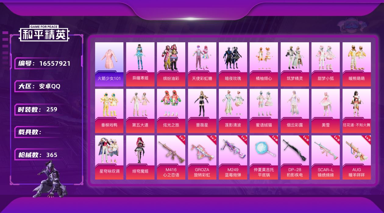 [16557921]安卓 手Q-20粉装-15特效枪-0载具-5粉色飞行器-125301热力值-19王牌印记-259套装-365枪皮