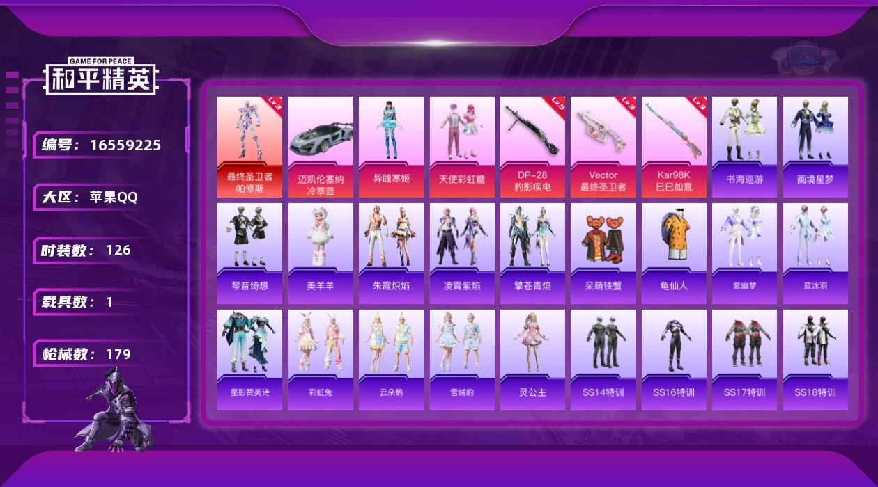 [16559225]苹果 手Q-1神装-2粉装-4特效枪-1载具-5粉色飞行器-55166热力值-5王牌印记-126套装-179枪皮