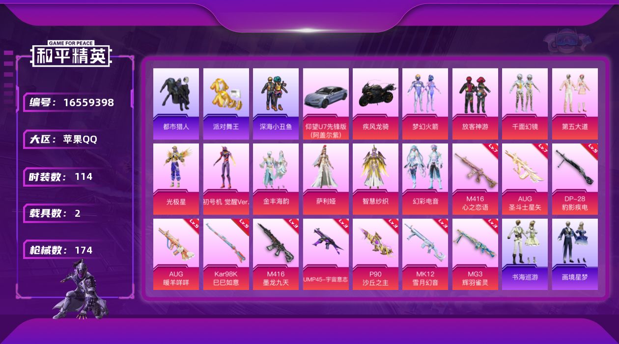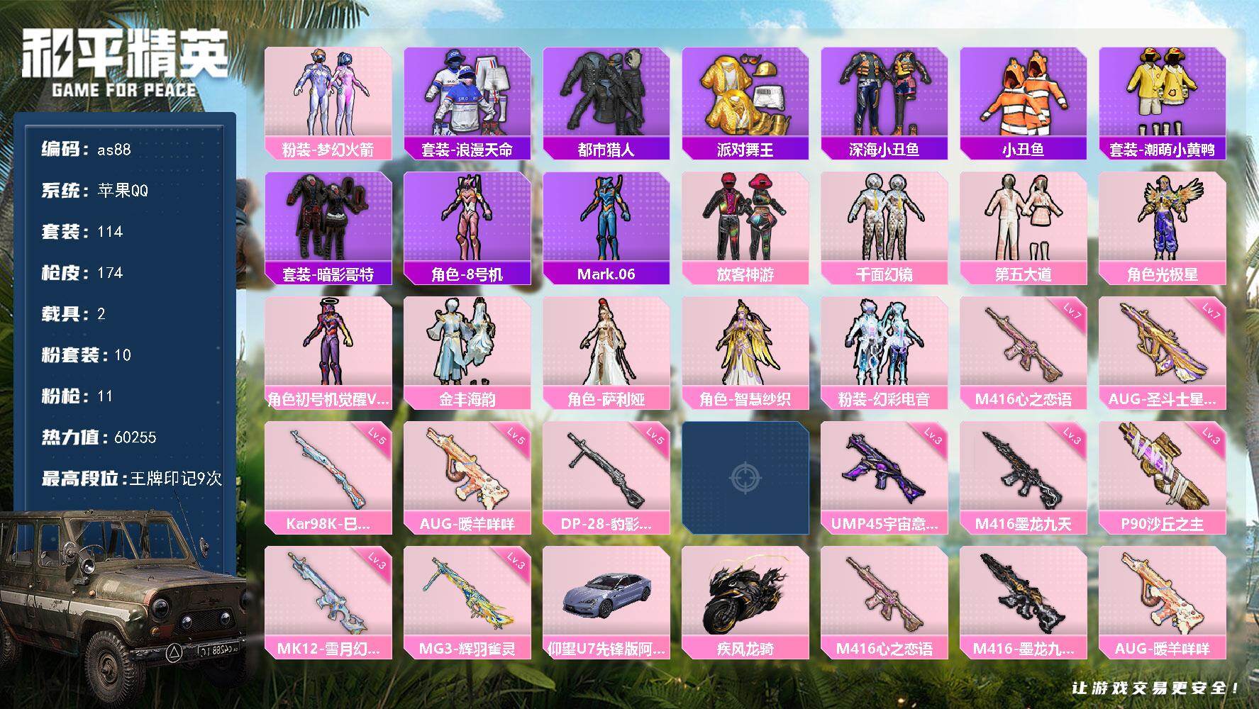 [16559398]苹果 手Q-10粉装-11特效枪-2载具-7粉色飞行器-60255热力值-9王牌印记-114套装-174枪皮