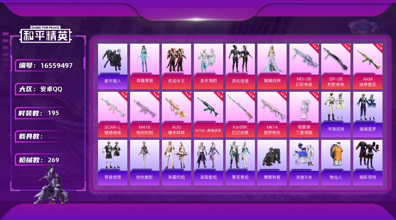 [16559497]安卓 手Q-5粉装-10特效枪-0载具-2粉色飞行器-76452热力值-20王牌印记-195套装-269枪皮 【热门品类】:绝对防御上衣,套装-浪漫天命,套装-都市猎人,套装-龟仙人,套装-暗影哥特 【粉色套装】:粉装-炙焰牛王,粉装-金丰海韵,粉装-英伦信使,角色-智耀战神,角色-异瞳寒姬 【粉色枪皮等级】:AKM-绿萝繁花(五级),SCAR-L-锦绣绵绵(五级),M416-电玩时刻(五级),AUG-暖羊咩咩(五级),M762-青锋波束(五级),Kar98K-巳巳如意(五级),Mk14-甜梦熊击(五级),DP-28-豹影疾电(五级),MG-36-幻彩电音(七级),烟雾弹-丁香清露(五级) 【粉色枪皮】:AKM-绿萝繁花,SCAR-L-锦绣绵绵,M416-电玩时刻,AUG-暖羊咩咩,M762-青锋波束,Kar98K-巳巳如意,Mk14-甜梦熊击,DP-28-豹影疾电,MG-36-幻彩电音,烟雾弹-丁香清露 【粉色飞行器】:千面幻镜飞行器 【粉色降落伞】:绝对恒星降落伞,星之彼岸降落伞,龙珠超降落伞,炫光之旅降落伞,蜜语绒猫降落伞,忍者神龟降落伞,英伦信使降落伞,千金淑猫降落伞,临安公主降落伞,星穹咏叹调降落伞,绯穹魔姬降落伞,魔童闹海 哪吒降落伞,炫彩糖果降落伞 【稀有套装】:套装-龟仙人,套装-巳巳如意,套装-雪国风尚,套装-炫彩糖果,套装-雏菊兔兔,套装-萝兰蝴蝶,套装-糖糖葫芦,套装-青团波波,套装-棉花软糖,角色-俏兔智灵,套装-燕燕于飞,套装-鱼渊荷华,套装-紫幽梦,套装-蓝冰羽,角色-瑰梦爱神,套装-云朵鹅,套装-雪绒豹,套装-朱霞炽焰,套装-凌霄紫焰,套装-擎苍青焰,角色-绯色魅影,套装-书海巡游,套装-画境星梦,套装-琴音绮想 【稀有枪皮】:AUG-冰晶雪宝,AKM-夜灯,AKM-奇异狩猎者,AKM-彩虹符号,AKM-影袭,AKM-生命誓言,AKM-破晓战魂,AKM-虎虎生威,AKM-霓虹街区,AKM-龙的传人,M16A4-幻世战舞者,M16A4-甜心亚梦,M16A4-红色方程式,M16A4-蓝色火焰,M16A4-千金淑猫,SCAR-L-夜灯,SCAR-L-炫彩节奏,SCAR-L-玉兔迎春,SCAR-L-红色方程式,M416-暗夜行者,M416-糯团青竹,M416-红色方程式,M416-绯红前夜,M416-蓝色火焰,GROZA-异彩先驱,GROZA
