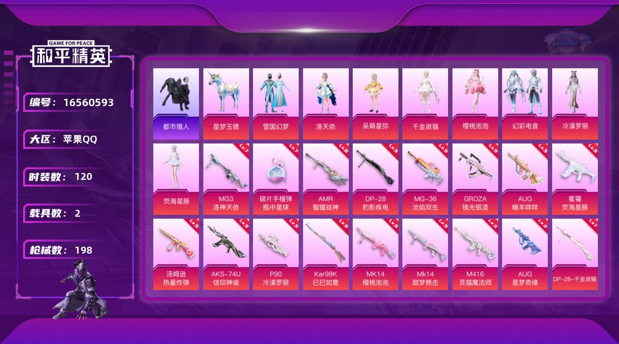 [16560593]苹果 手Q-9粉装-17特效枪-2载具-6粉色飞行器-64582热力值-8王牌印记-120套装-198枪皮