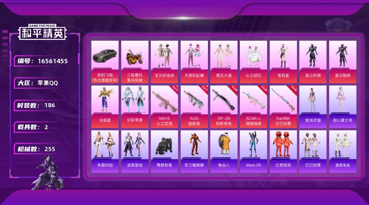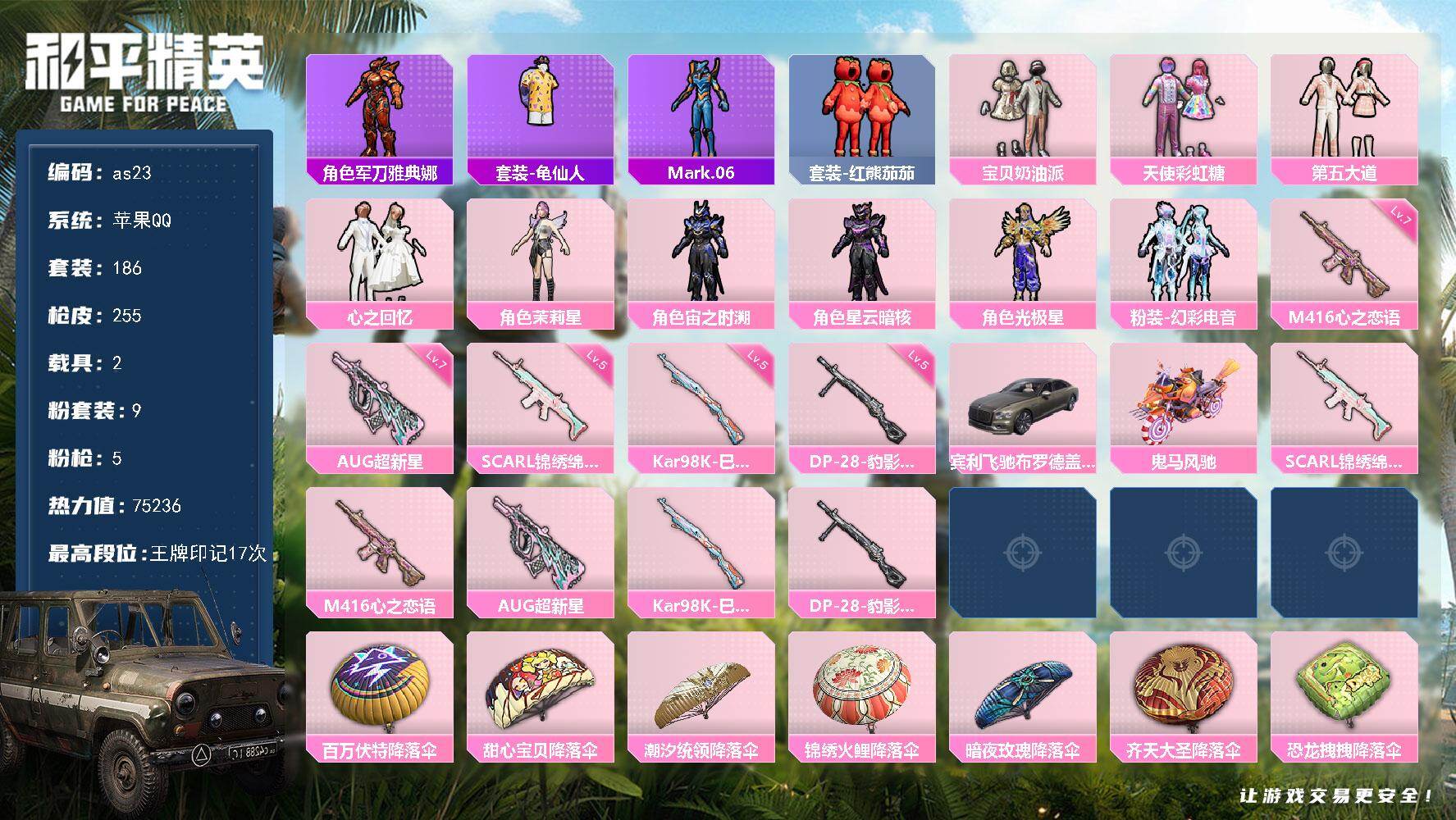 [16561455]苹果 手Q-9粉装-5特效枪-2载具-3粉色飞行器-75236热力值-17王牌印记-186套装-255枪皮