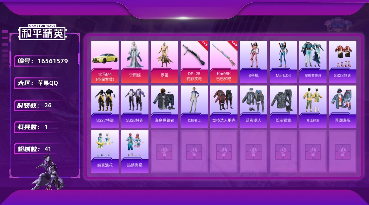 [16561579]苹果 手Q-2粉装-2特效枪-1载具-0粉色飞行器-13671热力值-1王牌印记-26套装-41枪皮