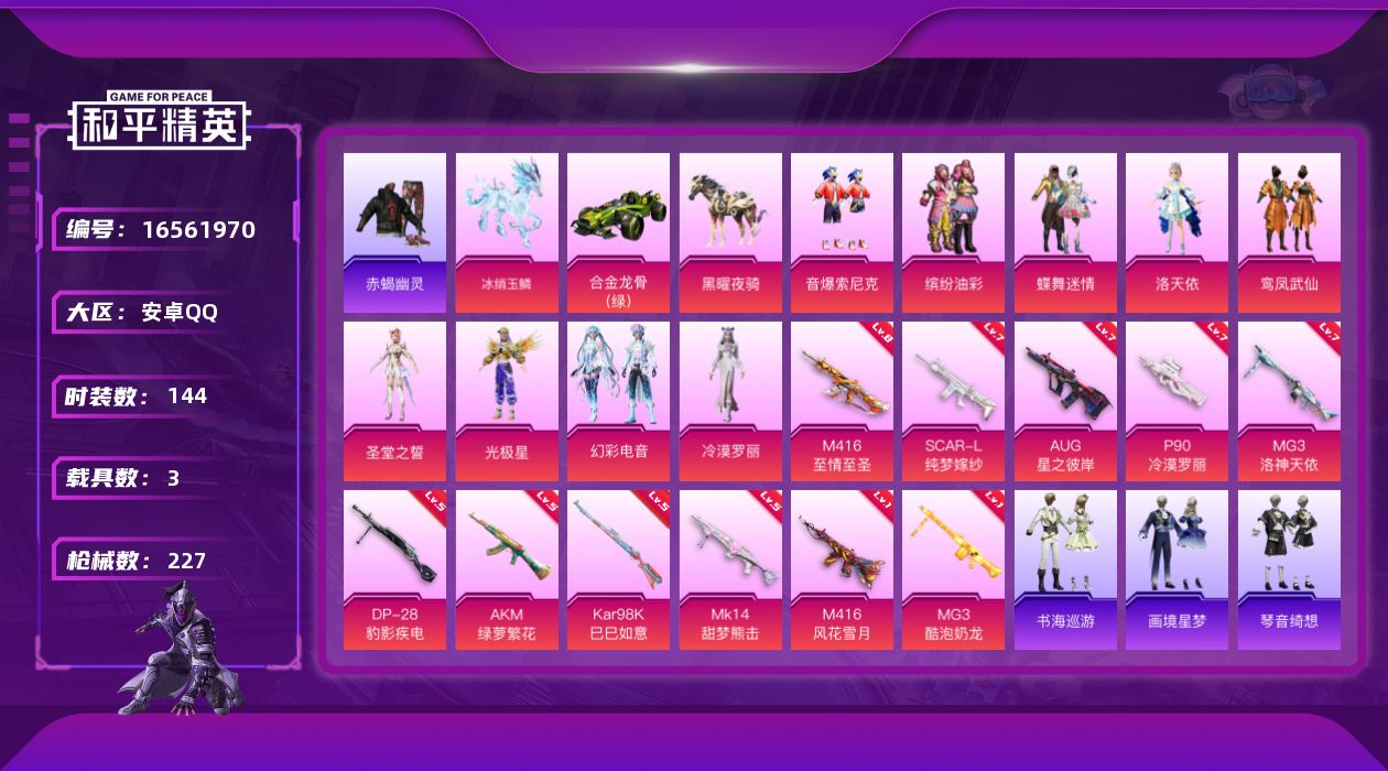 [16561970]安卓 手Q-9粉装-11特效枪-3载具-8粉色飞行器-78317热力值-12王牌印记-144套装-227枪皮