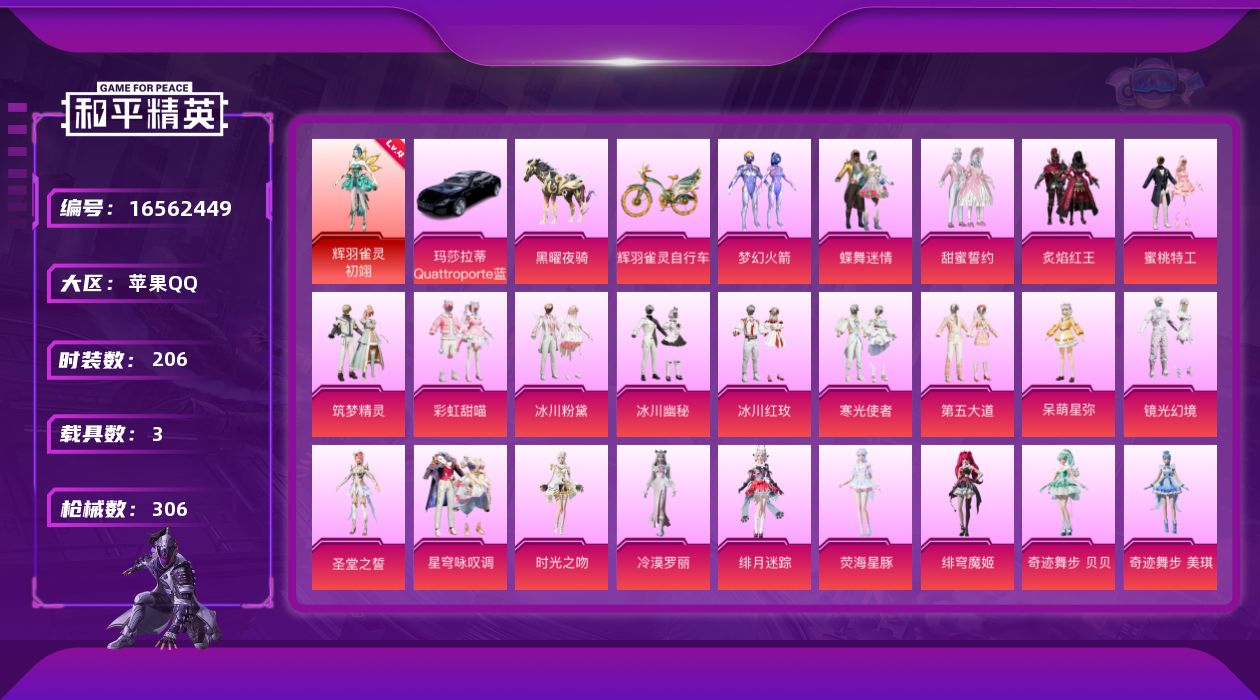 [16562449]苹果 手Q-1神装-24粉装-9特效枪-3载具-9粉色飞行器-101435热力值-8王牌印记-206套装-306枪皮