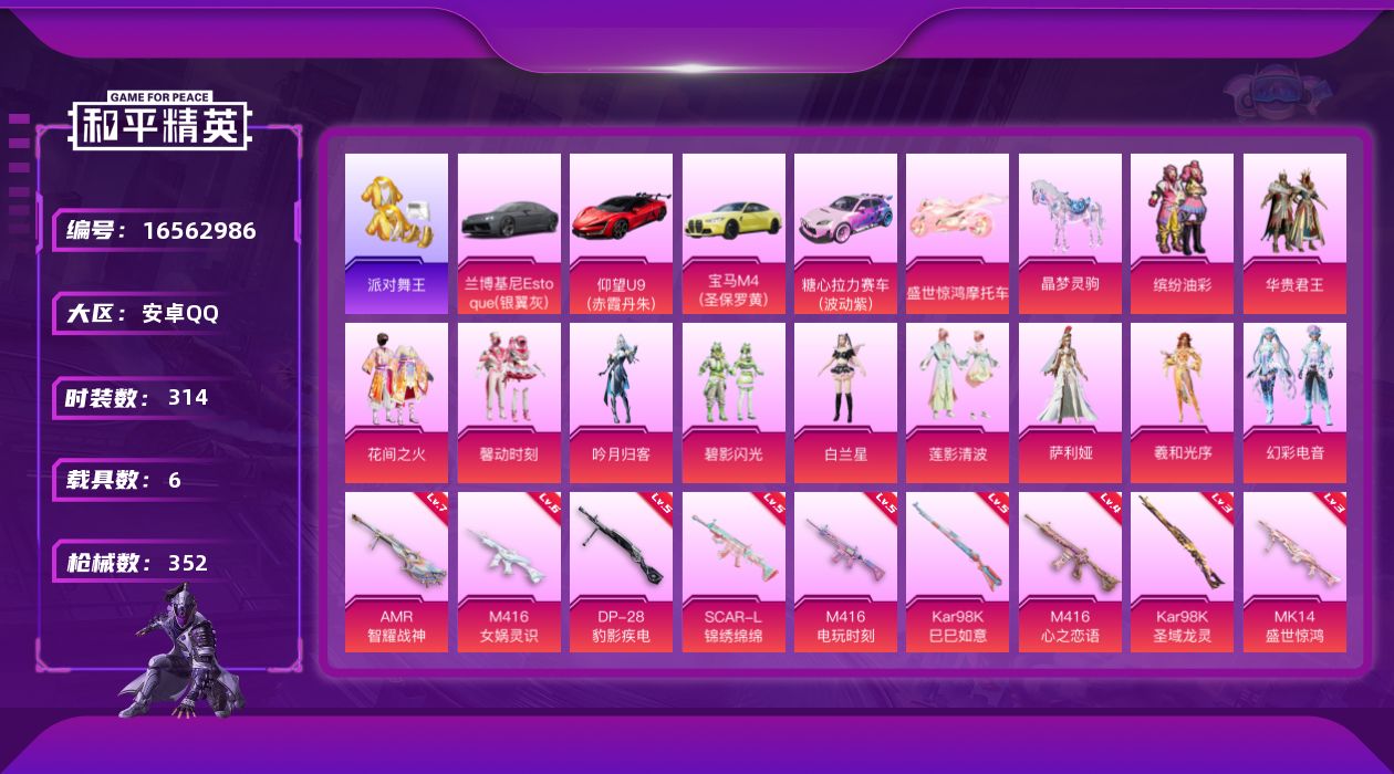 [16562986]安卓 手Q-11粉装-9特效枪-6载具-10粉色飞行器-123707热力值-16王牌印记-314套装-352枪皮