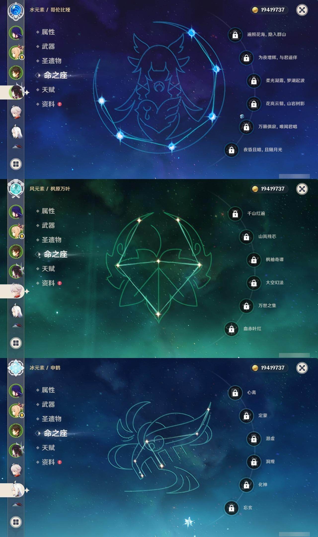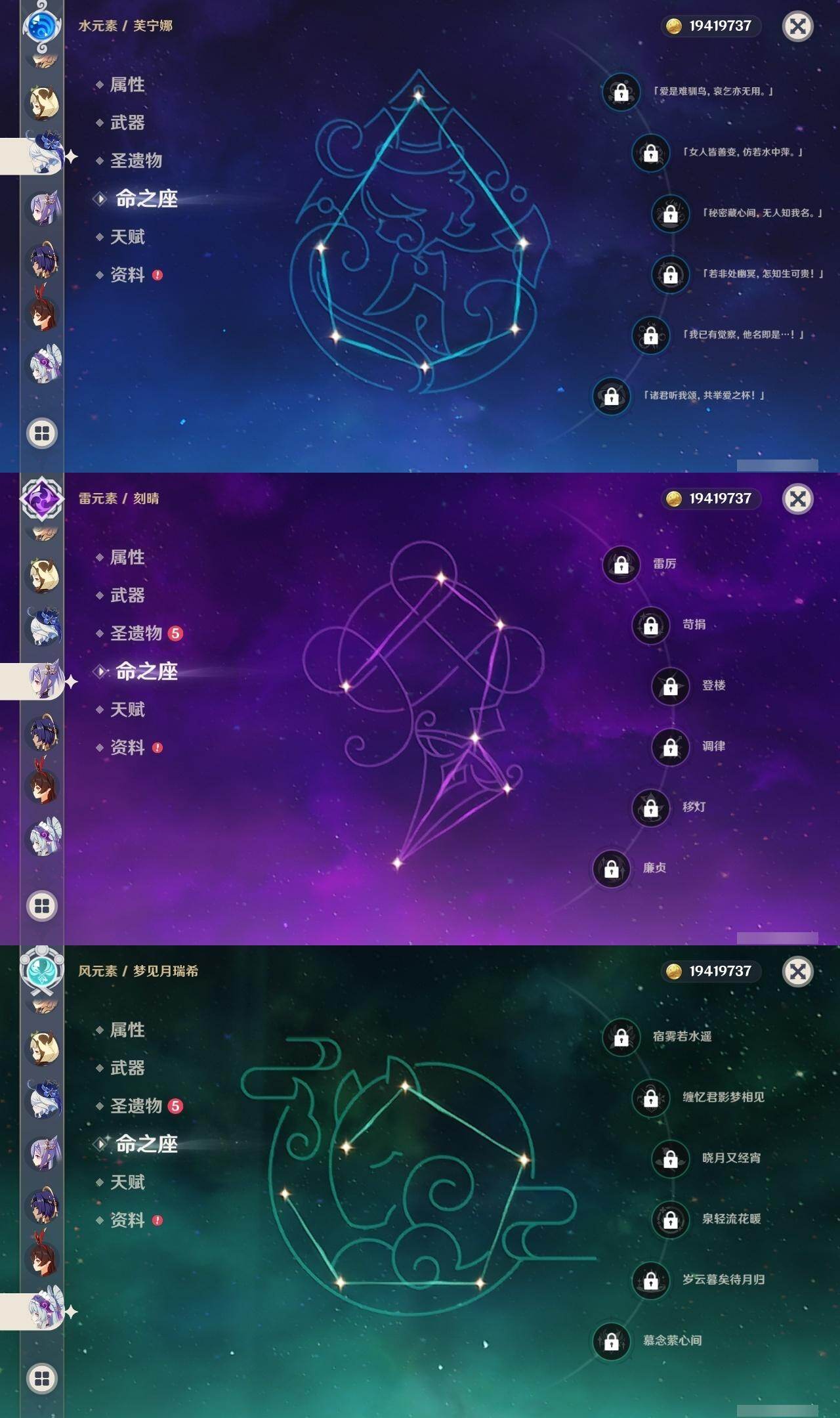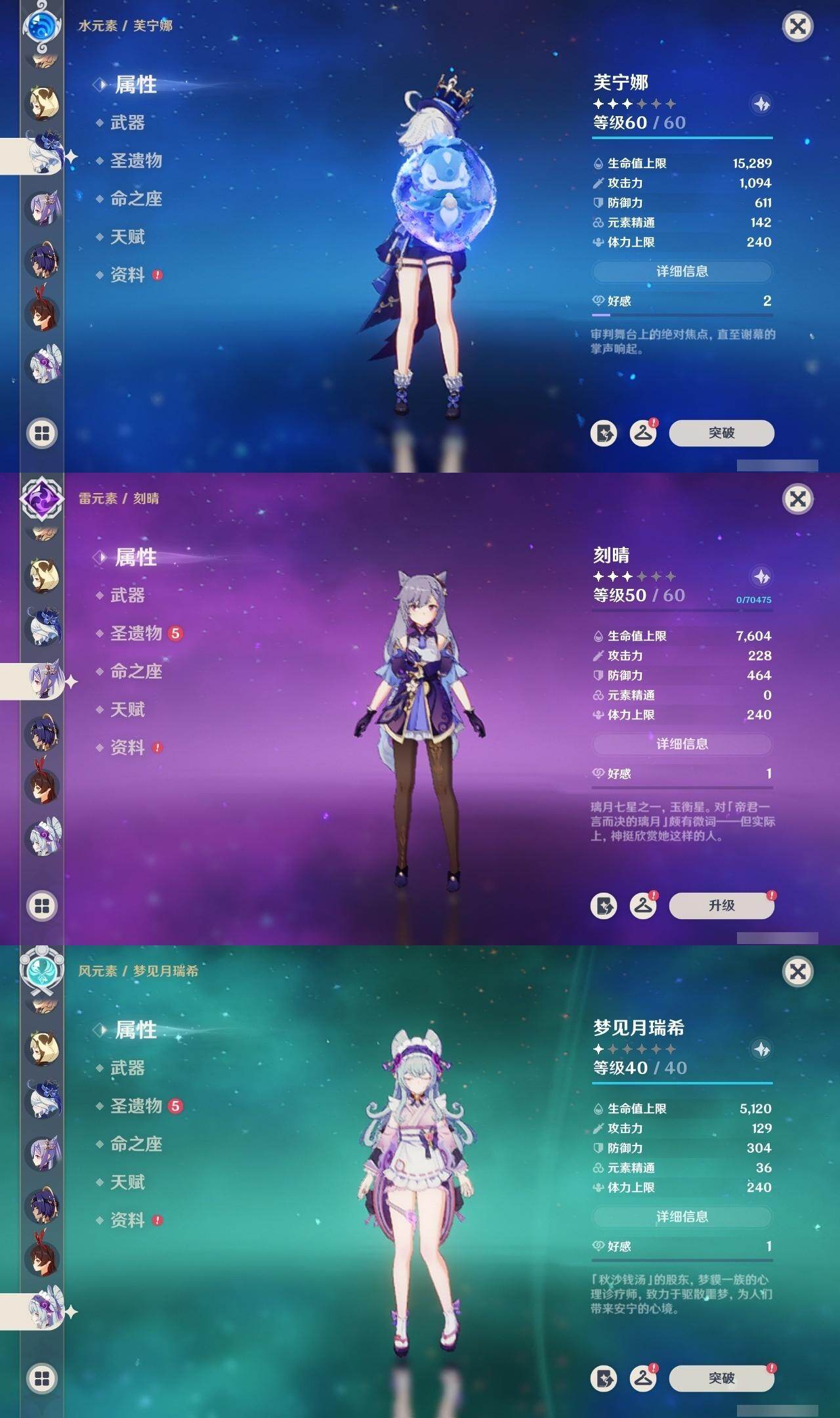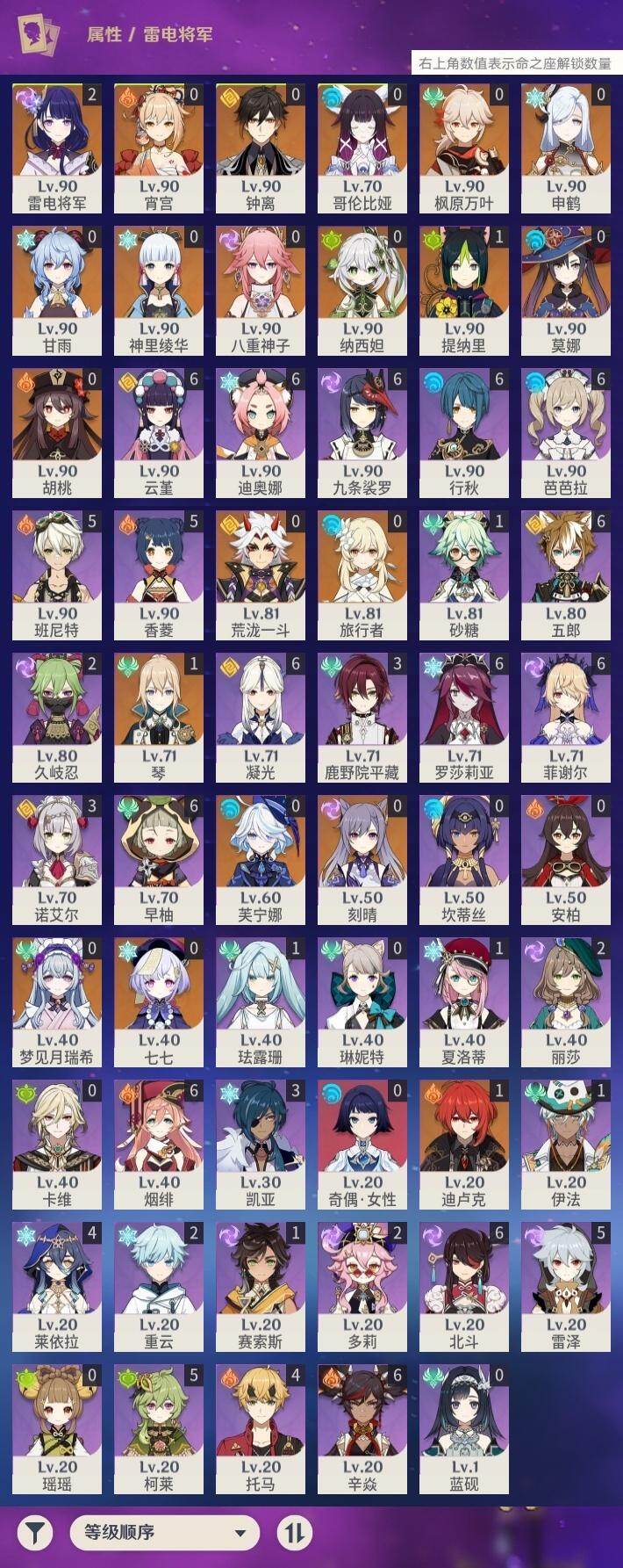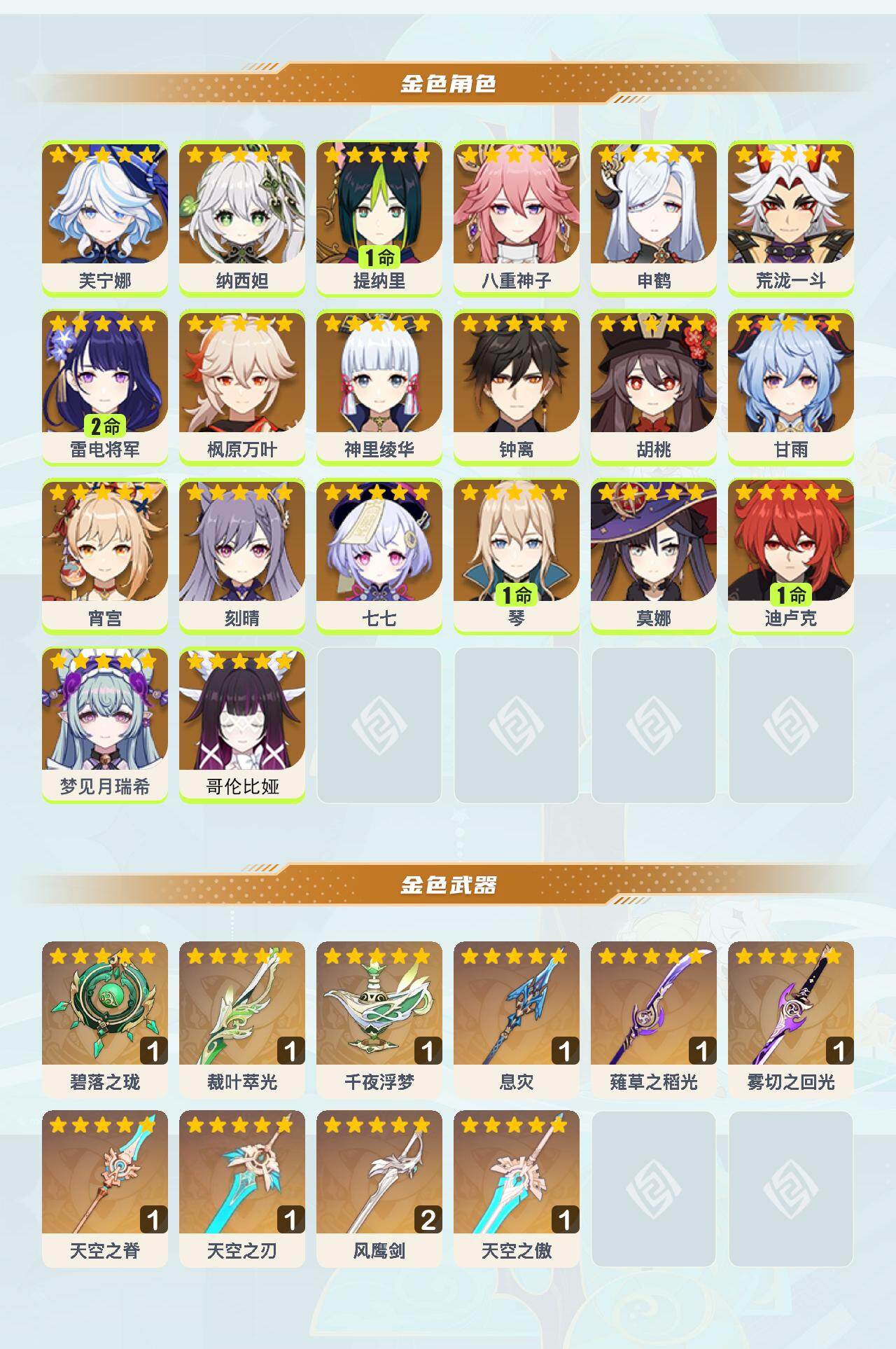 0命芙宁娜,0命纳西妲,1命提纳里,0命八重神子,0命申鹤,0命荒泷一斗,2命雷电将军,0命枫原万叶,0命神里绫华,0命钟离,0命胡桃,0命甘雨,0命宵宫,0命刻晴,0命七七,1命琴,0命莫娜,1命迪卢克,0命梦见月瑞希,0命哥伦比娅,精1碧落之珑,精1裁叶萃光,精1千夜浮梦,精1息灾,精1薙草之稻光,精1雾切之回光,精1天空之脊,精1天空之刃,精2风鹰剑,精1天空之傲