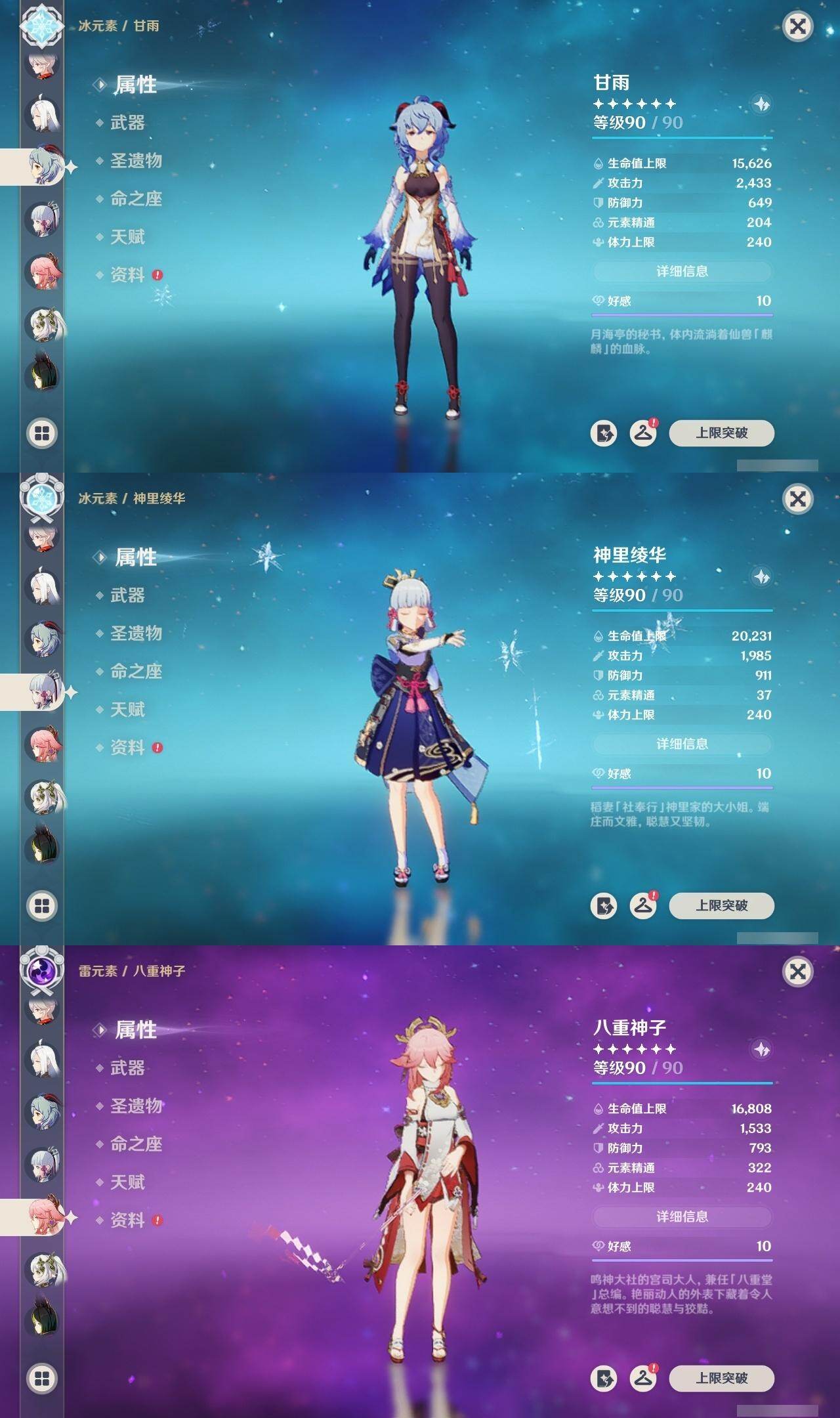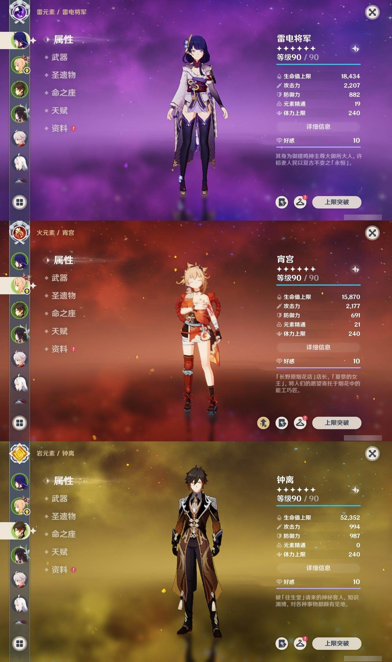 雷电将军,宵宫,钟离,枫原万叶,申鹤,甘雨,神里凌华,八重神子,莫娜,胡桃,荒泷一斗,琴,刻晴,七七,迪卢克