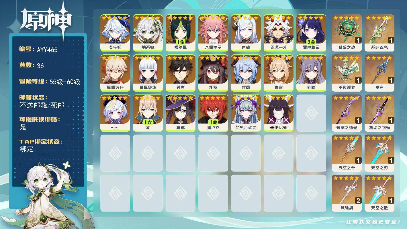[16563017]59级/36黄/女主/20个五星角色/10个五星武器 0命芙宁娜,0命纳西妲,1命提纳里,0命八重神子,0命申鹤,0命荒泷一斗,2命雷电将军,0命枫原万叶,0命神里绫华,0命钟离,0命胡桃,0命甘雨,0命宵宫,0命刻晴,0命七七,1命琴,0命莫娜,1命迪卢克,0命梦见月瑞希,0命哥伦比娅,精1碧落之珑,精1裁叶萃光,精1千夜浮梦,精1息灾,精1薙草之稻光,精1雾切之回光,精1天空之脊,精1天空之刃,精2风鹰剑,精1天空之傲