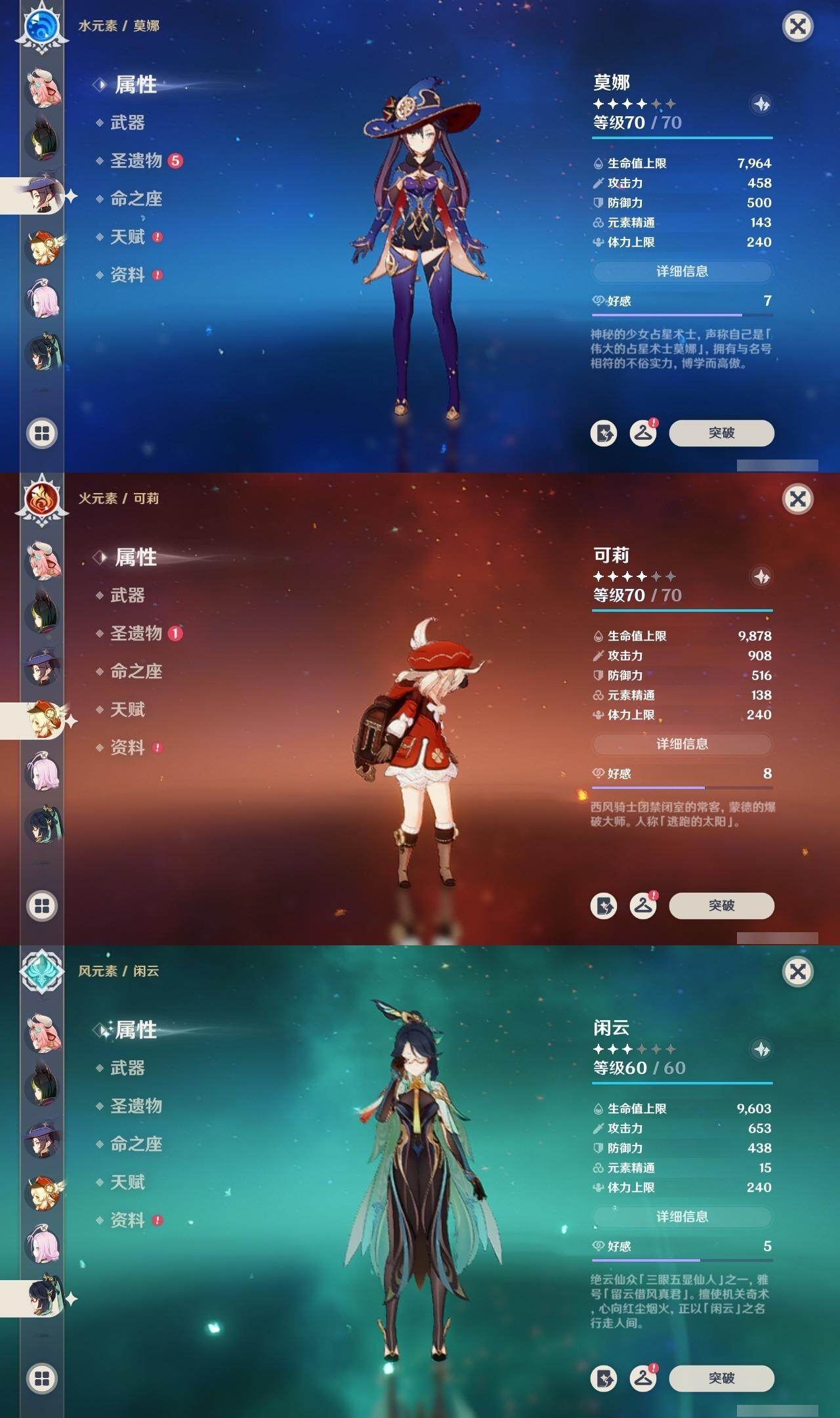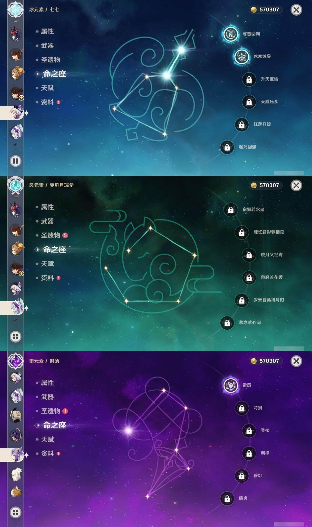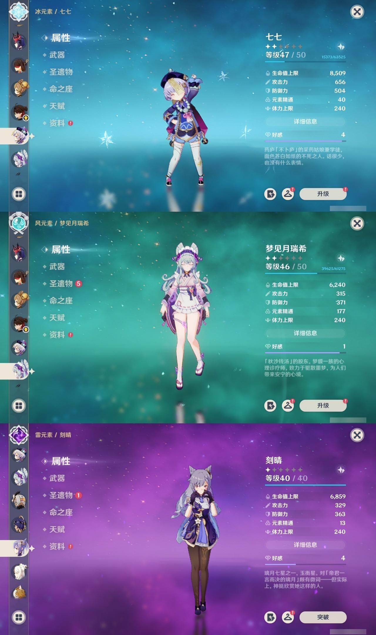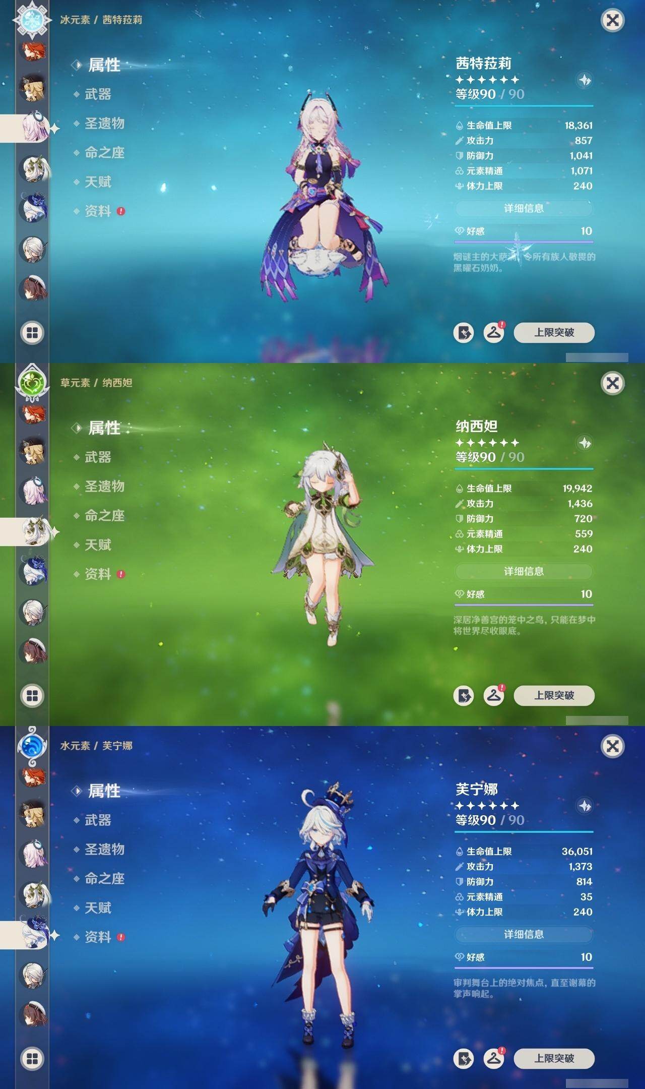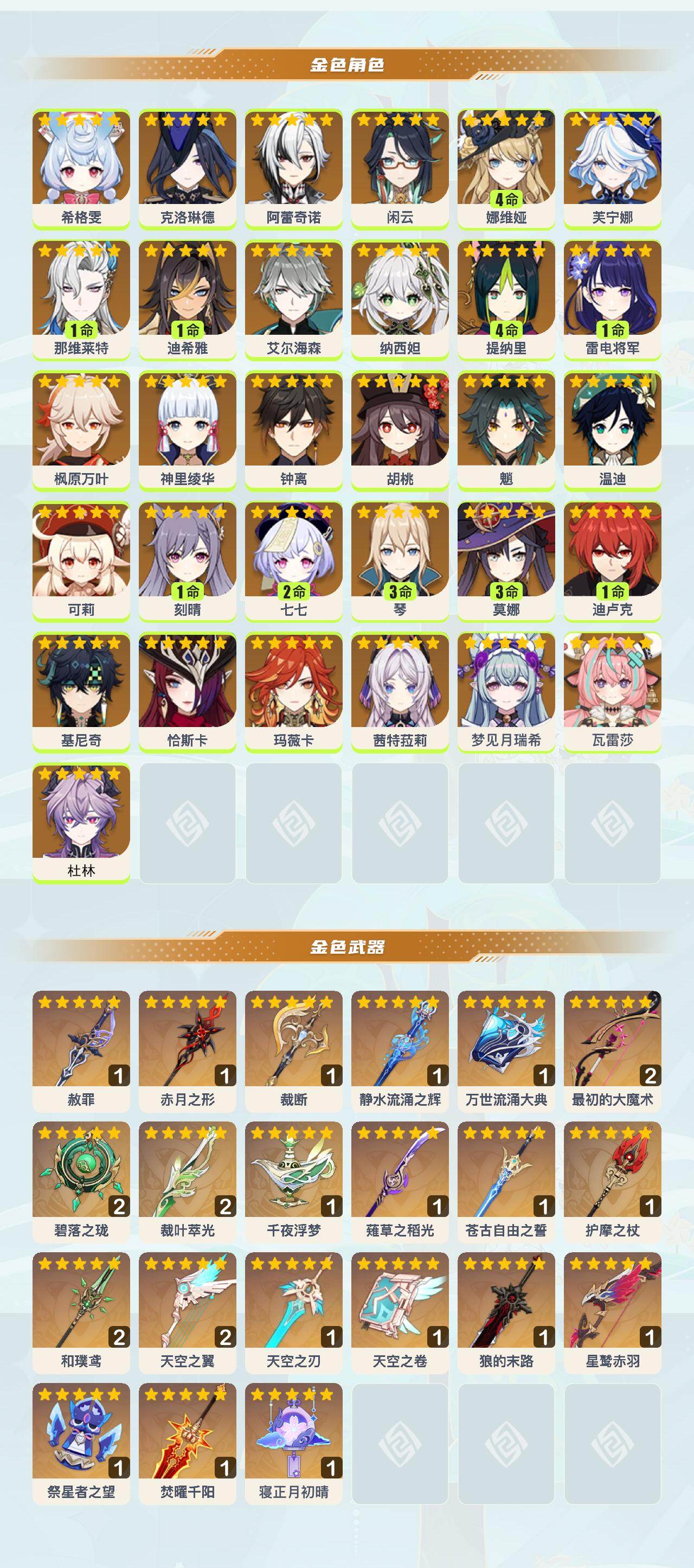 0命希格雯,0命克洛琳德,0命阿蕾奇诺,0命闲云,4命娜维娅,0命芙宁娜,1命那维莱特,1命迪希雅,0命艾尔海森,0命纳西妲,4命提纳里,1命雷电将军,0命枫原万叶,0命神里绫华,0命钟离,0命胡桃,0命魈,0命温迪,0命可莉,1命刻晴,2命七七,3命琴,3命莫娜,1命迪卢克,0命基尼奇,0命恰斯卡,0命玛薇卡,0命茜特菈莉,0命梦见月瑞希,0命瓦雷莎,0命杜林,精1赦罪,精1赤月之形,精1裁断,精1静水流涌之辉,精1万世流涌大典,精2最初的大魔术,精2碧落之珑,精2裁叶萃光,精1千夜浮梦,精1薙草之稻光,精1苍古自由之誓,精1护摩之杖,精2和璞鸢,精2天空之翼,精1天空之刃,精1天空之卷,精1狼的末路,精1星鹫赤羽,精1祭星者之望,精1焚曜千阳,精1寝正月初晴