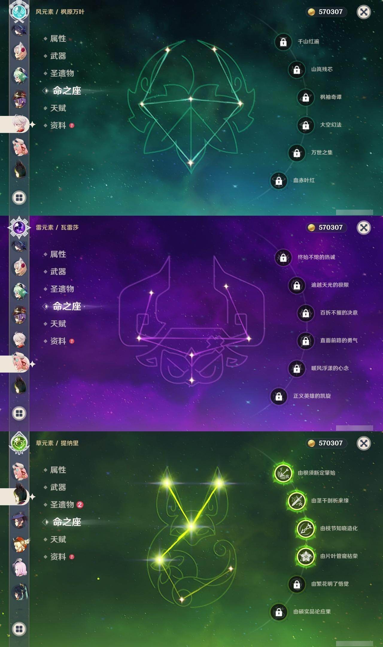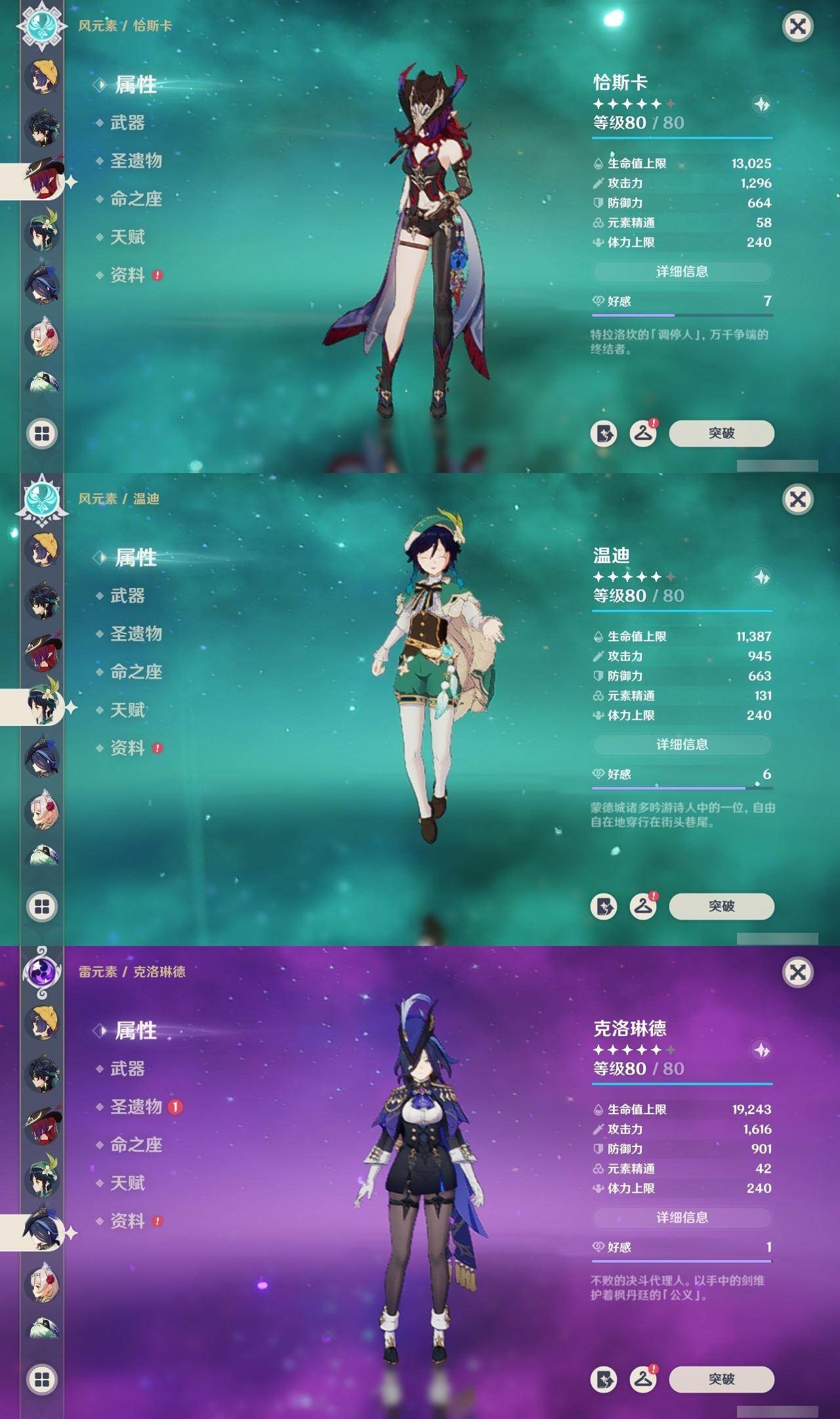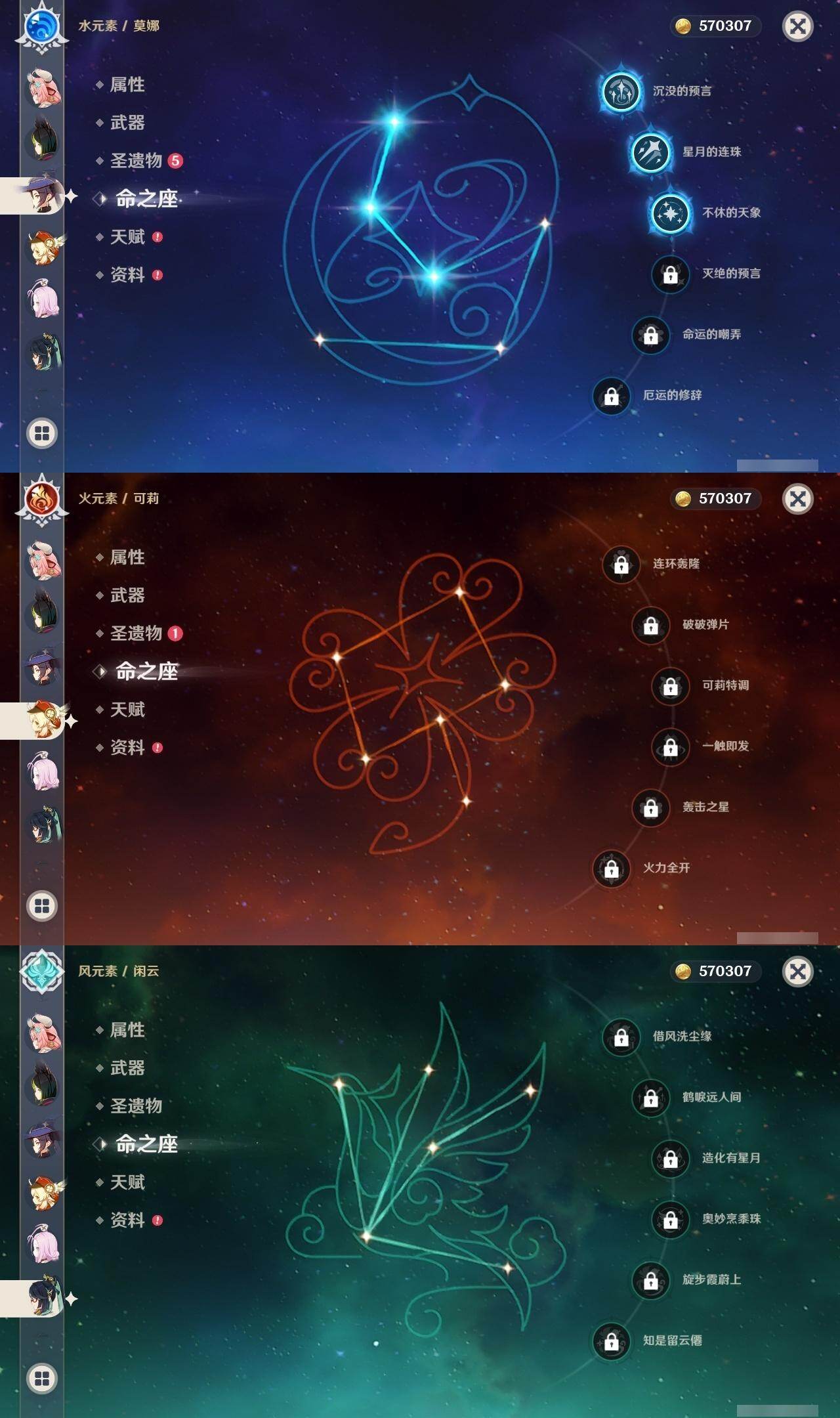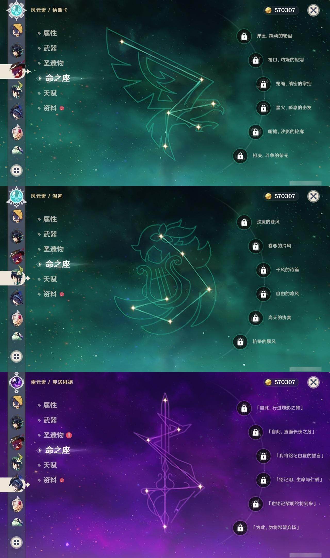 0命希格雯,0命克洛琳德,0命阿蕾奇诺,0命闲云,4命娜维娅,0命芙宁娜,1命那维莱特,1命迪希雅,0命艾尔海森,0命纳西妲,4命提纳里,1命雷电将军,0命枫原万叶,0命神里绫华,0命钟离,0命胡桃,0命魈,0命温迪,0命可莉,1命刻晴,2命七七,3命琴,3命莫娜,1命迪卢克,0命基尼奇,0命恰斯卡,0命玛薇卡,0命茜特菈莉,0命梦见月瑞希,0命瓦雷莎,0命杜林,精1赦罪,精1赤月之形,精1裁断,精1静水流涌之辉,精1万世流涌大典,精2最初的大魔术,精2碧落之珑,精2裁叶萃光,精1千夜浮梦,精1薙草之稻光,精1苍古自由之誓,精1护摩之杖,精2和璞鸢,精2天空之翼,精1天空之刃,精1天空之卷,精1狼的末路,精1星鹫赤羽,精1祭星者之望,精1焚曜千阳,精1寝正月初晴