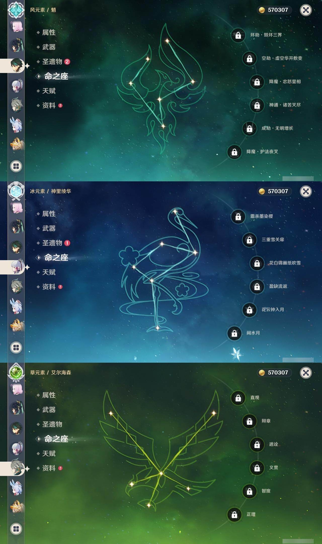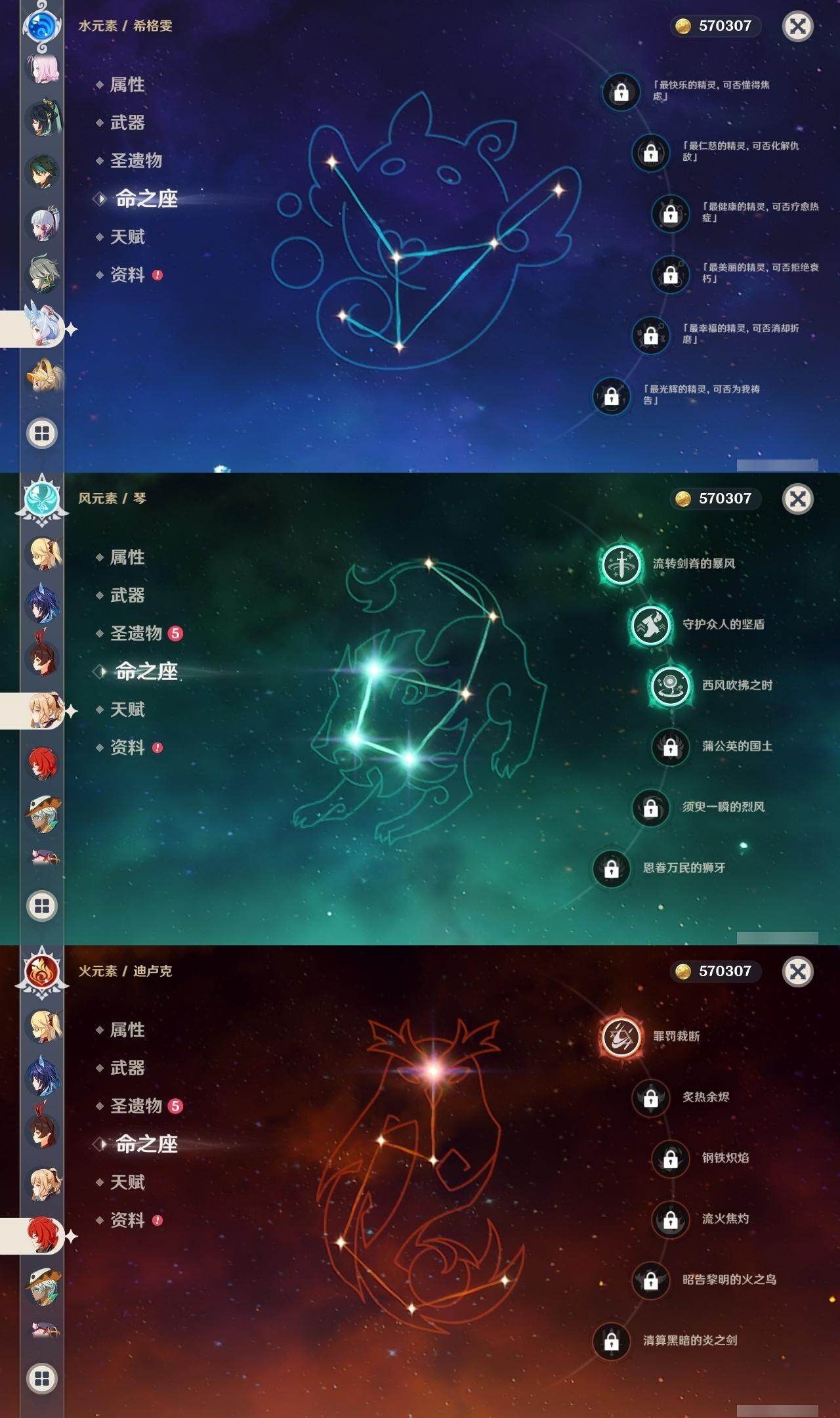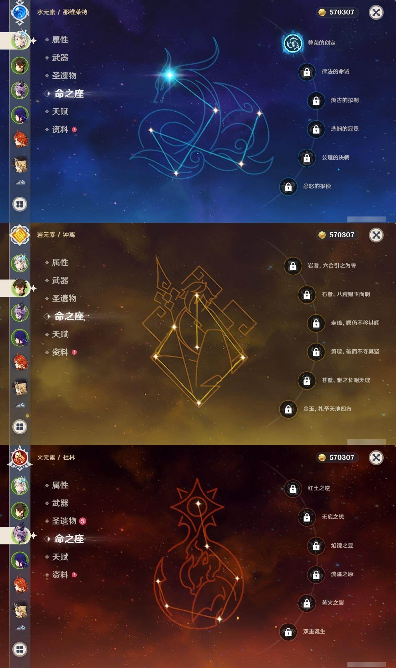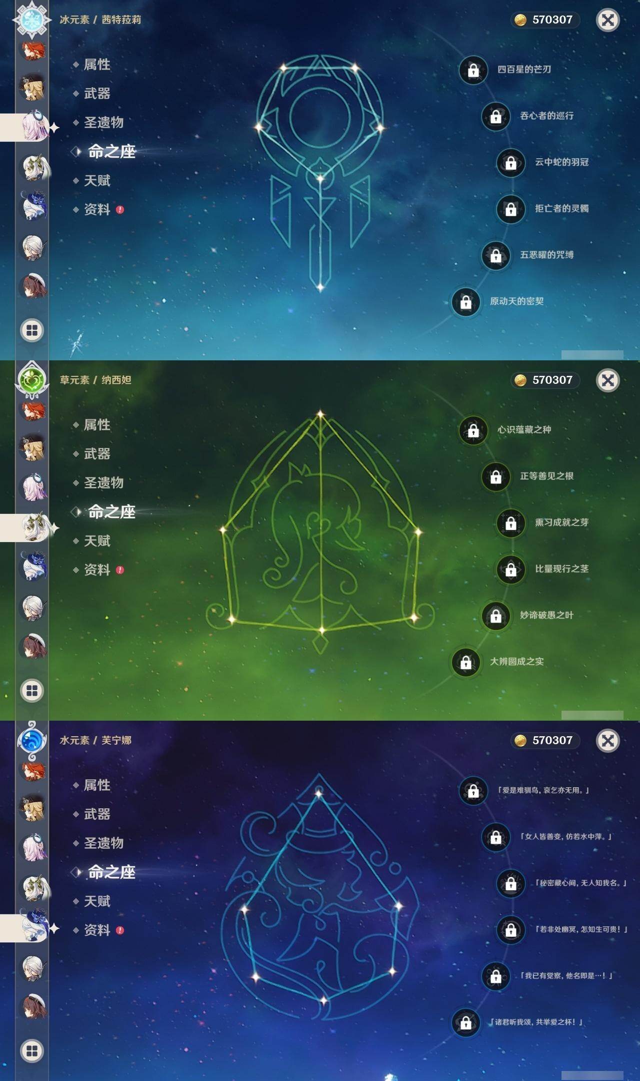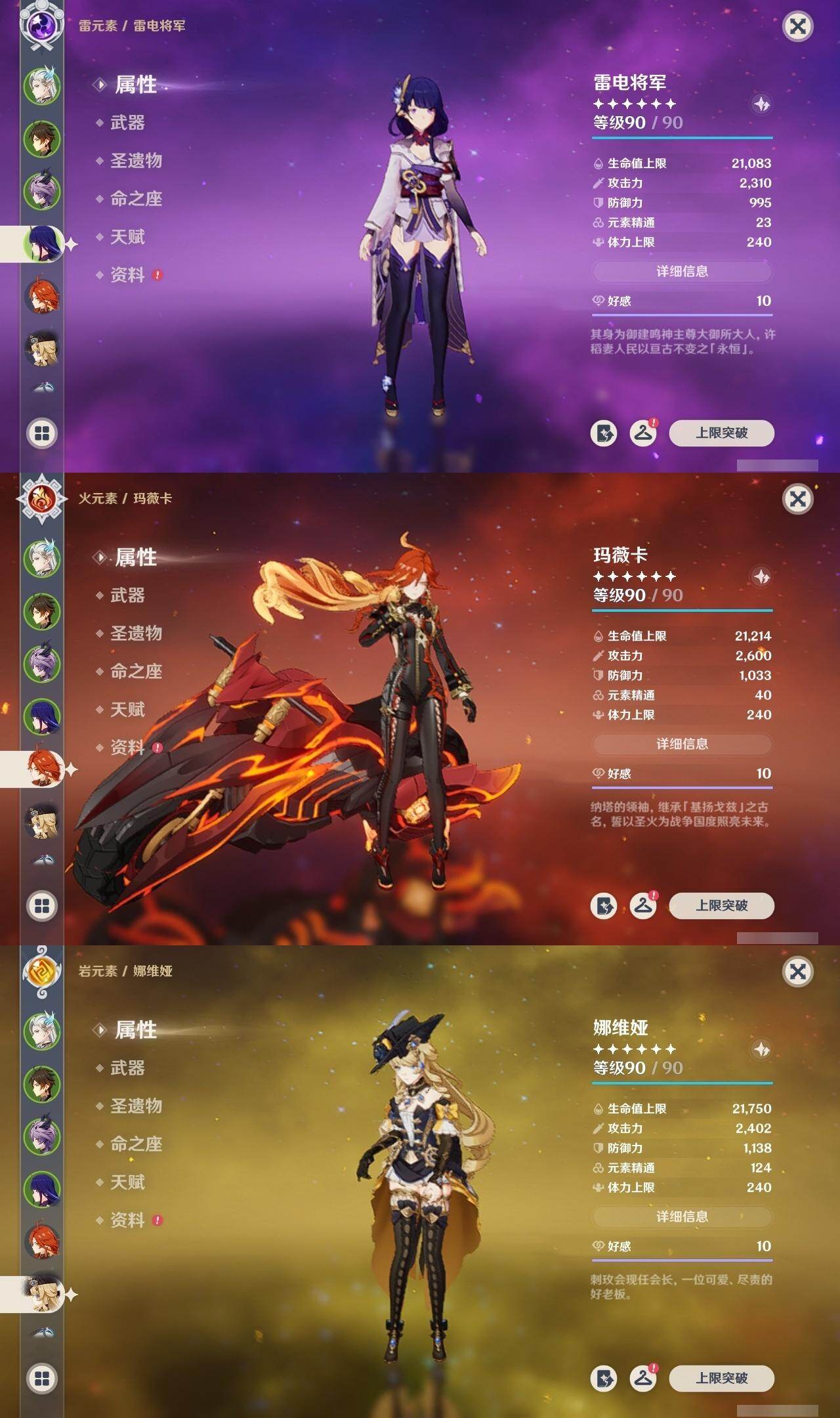 0命希格雯,0命克洛琳德,0命阿蕾奇诺,0命闲云,4命娜维娅,0命芙宁娜,1命那维莱特,1命迪希雅,0命艾尔海森,0命纳西妲,4命提纳里,1命雷电将军,0命枫原万叶,0命神里绫华,0命钟离,0命胡桃,0命魈,0命温迪,0命可莉,1命刻晴,2命七七,3命琴,3命莫娜,1命迪卢克,0命基尼奇,0命恰斯卡,0命玛薇卡,0命茜特菈莉,0命梦见月瑞希,0命瓦雷莎,0命杜林,精1赦罪,精1赤月之形,精1裁断,精1静水流涌之辉,精1万世流涌大典,精2最初的大魔术,精2碧落之珑,精2裁叶萃光,精1千夜浮梦,精1薙草之稻光,精1苍古自由之誓,精1护摩之杖,精2和璞鸢,精2天空之翼,精1天空之刃,精1天空之卷,精1狼的末路,精1星鹫赤羽,精1祭星者之望,精1焚曜千阳,精1寝正月初晴