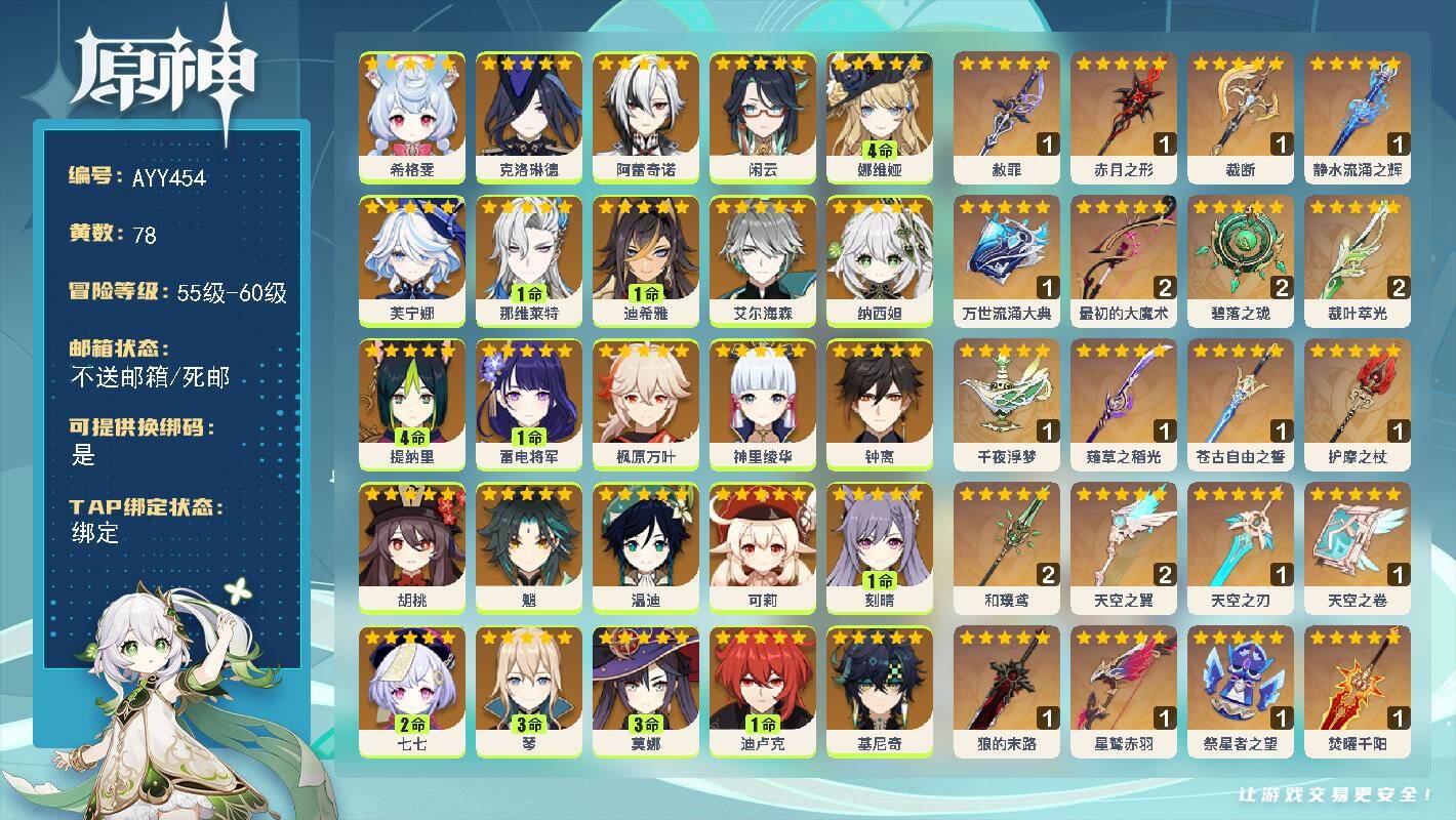 [16563010]58级/78黄/男主/31个五星角色/21个五星武器 0命希格雯,0命克洛琳德,0命阿蕾奇诺,0命闲云,4命娜维娅,0命芙宁娜,1命那维莱特,1命迪希雅,0命艾尔海森,0命纳西妲,4命提纳里,1命雷电将军,0命枫原万叶,0命神里绫华,0命钟离,0命胡桃,0命魈,0命温迪,0命可莉,1命刻晴,2命七七,3命琴,3命莫娜,1命迪卢克,0命基尼奇,0命恰斯卡,0命玛薇卡,0命茜特菈莉,0命梦见月瑞希,0命瓦雷莎,0命杜林,精1赦罪,精1赤月之形,精1裁断,精1静水流涌之辉,精1万世流涌大典,精2最初的大魔术,精2碧落之珑,精2裁叶萃光,精1千夜浮梦,精1薙草之稻光,精1苍古自由之誓,精1护摩之杖,精2和璞鸢,精2天空之翼,精1天空之刃,精1天空之卷,精1狼的末路,精1星鹫赤羽,精1祭星者之望,精1焚曜千阳,精1寝正月初晴